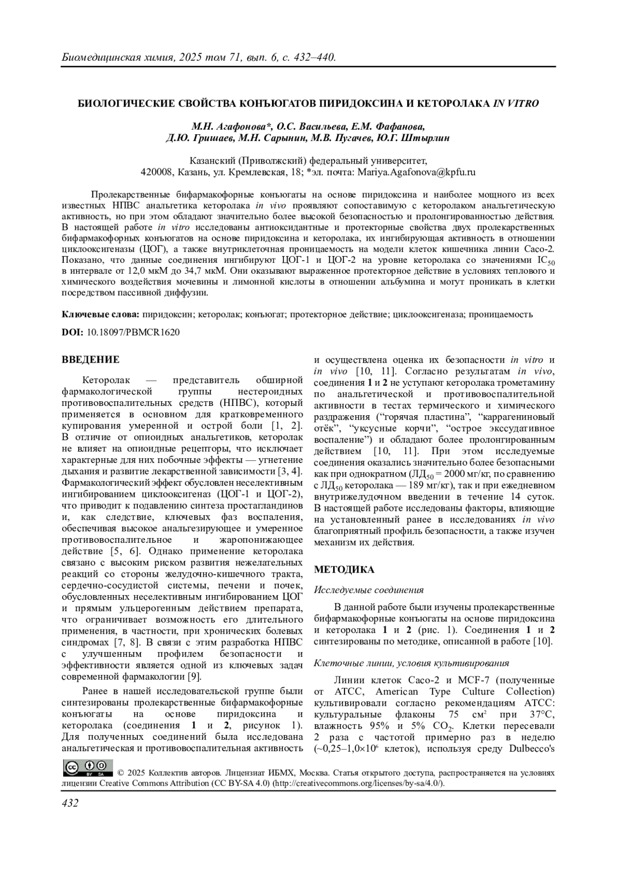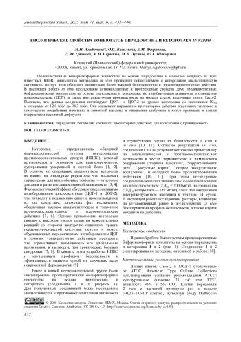 11. Васильева О.С., Агафонова М.Н., Пугачев М.В., Маланьева А.Г., Штырлин Ю.Г. (2025) Анальгетические и противовоспалительные свойства пролекарственных бифармакофорных производных на основе пиридоксина и кеторолака. Ученые записки Казанского университета. Серия Естественные науки, 167(3), 371-384. DOI: 10.26907/2542-064X.2025.3.371-384