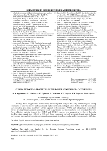 Пролекарственные бифармакофорные конъюгаты на основе пиридоксина и наиболее мощного из всех известных НПВС анальгетика кеторолака in vivo проявляют сопоставимую с кеторолаком анальгетическую активность, но при этом обладают значительно более высокой безопасностью и пролонгированностью действия. В настоящей работе in vitro исследованы антиоксидантные и протекторные свойства двух пролекарственных бифармакофорных конъюгатов на основе пиридоксина и кеторолака, их ингибирующая активность в отношении циклооксигеназы (ЦОГ), а также внутриклеточная проницаемость на модели клеток кишечника линии Сасо-2. Показано, что данные соединения ингибируют ЦОГ-1 и ЦОГ-2 на уровне кеторолака со значениями IC50 в интервале от 12,0 мкМ до 34,7 мкМ. Они оказывают выраженное протекторное действие в условиях теплового и химического воздействия мочевины и лимонной кислоты в отношении альбумина и могут проникать в клетки посредством пассивной диффузии.