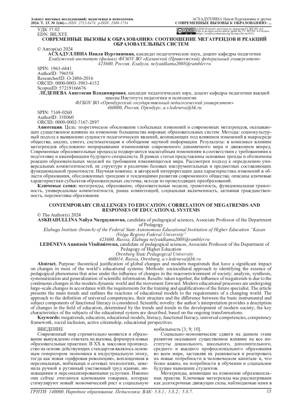 Результаты: в комплексе влияние мегатрендов обусловлено непрерывными изменениями современного динамичного мира и движением вперед. Современные образовательные процессы подвергаются масштабным изменениям в соответствии с требованиями к подготовке и квалификации будущего специалиста. В рамках статьи представлены основные тренды и обозначены реакции образовательных моделей на требования изменяющегося мира. Рассмотрен подход к определению универсальных компетентностей, их структуре и различию базовых инструментальных и предметных составляющих функциональной грамотности. Научная новизна: в авторской интерпретации дана характеристика изменений в области образования, обусловленных трендами и тенденциями развития современного общества; описаны ключевые характеристики субъектов образовательных системы, исходя из происходящих преобразований.