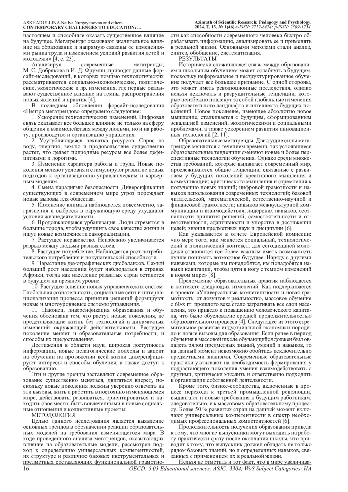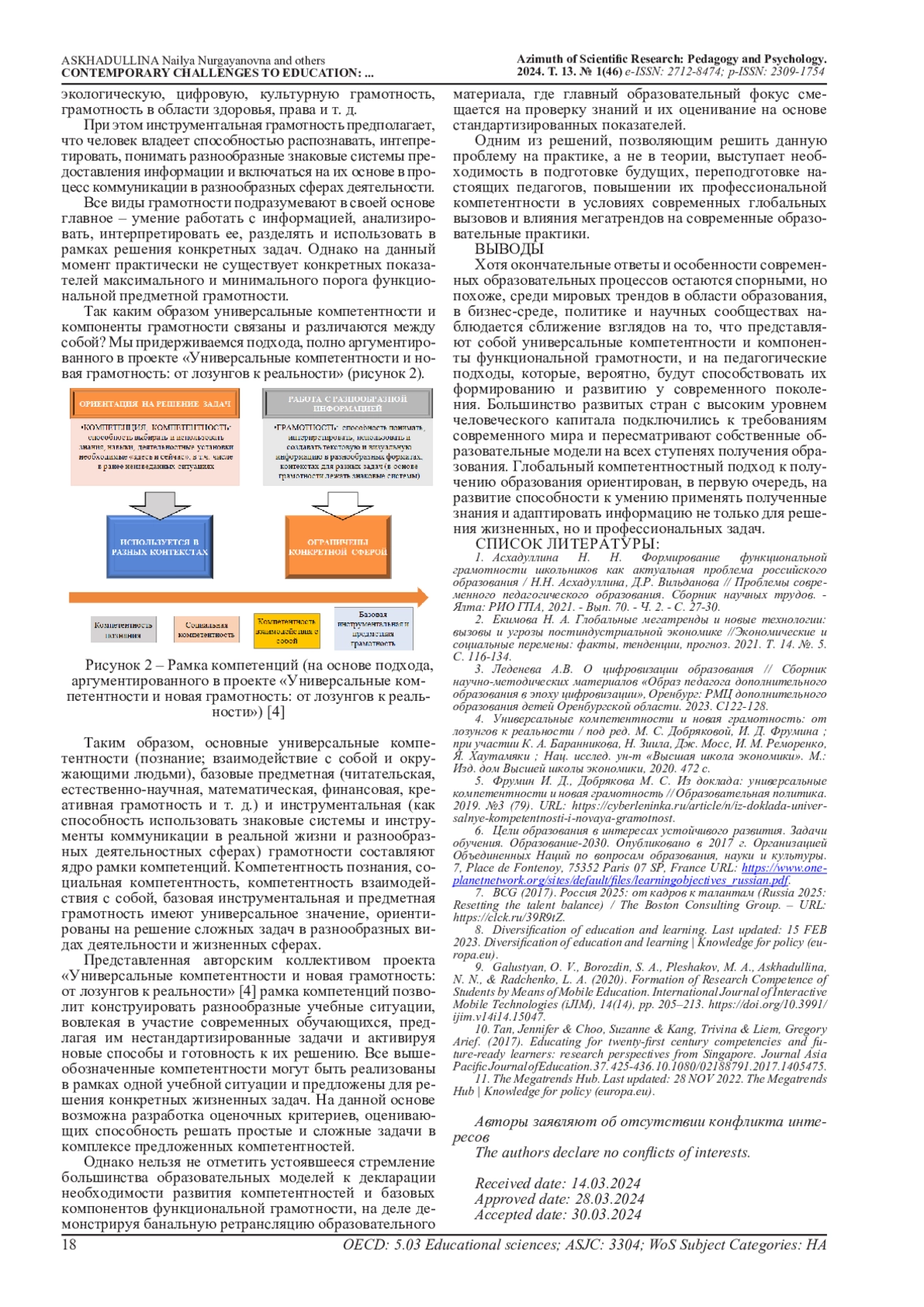 1. Асхадуллина, Н. Н. Формирование функциональной грамотности школьников как актуальная проблема российского образования / Н.Н. Асхадуллина, Д.Р. Вильданова // Проблемы современного педагогического образования. Сборник научных трудов. - Ялта: РИО ГПА, 2021. - Вып. 70. - Ч. 2. - С. 27-30. EDN: DIASIB