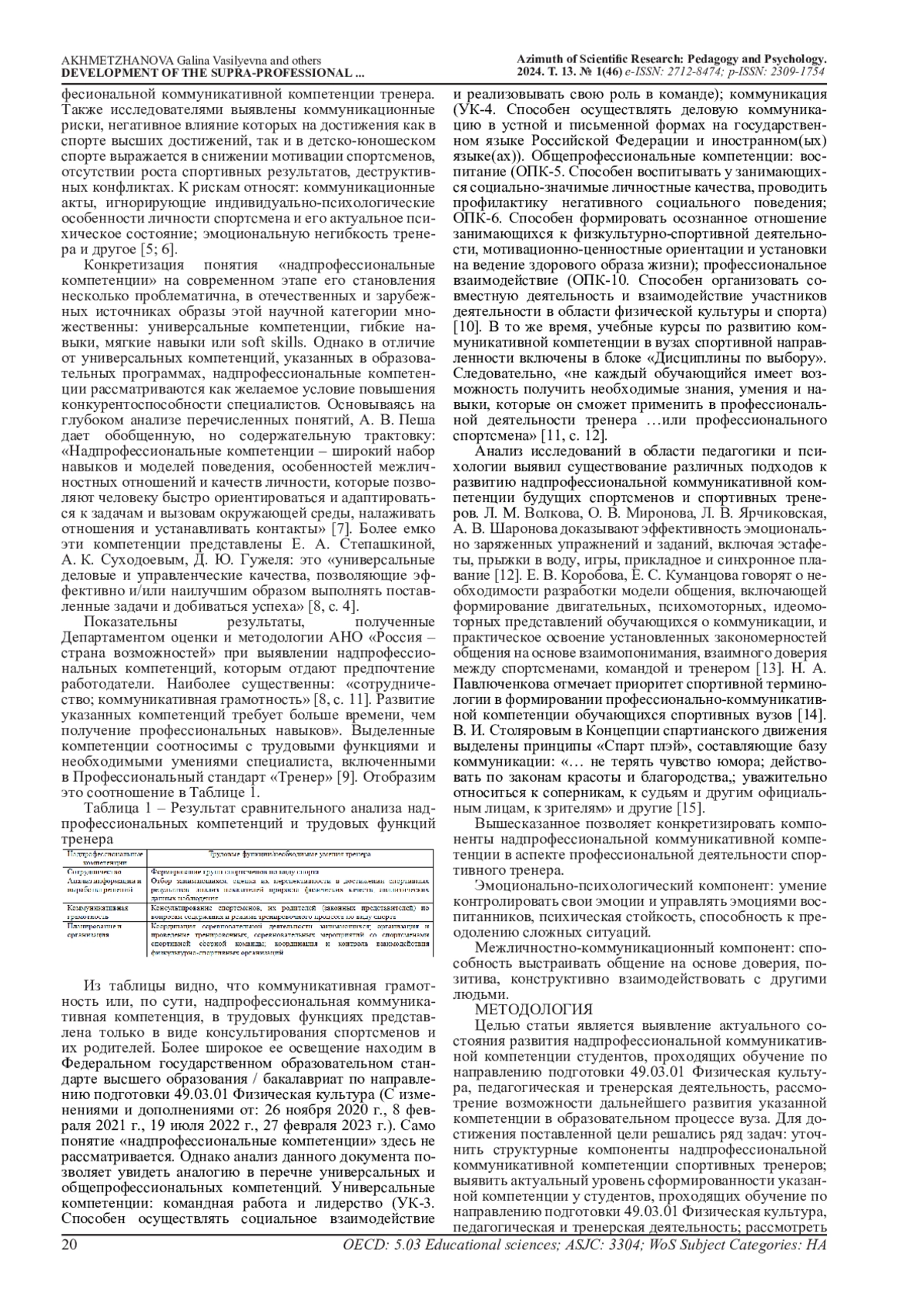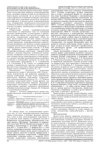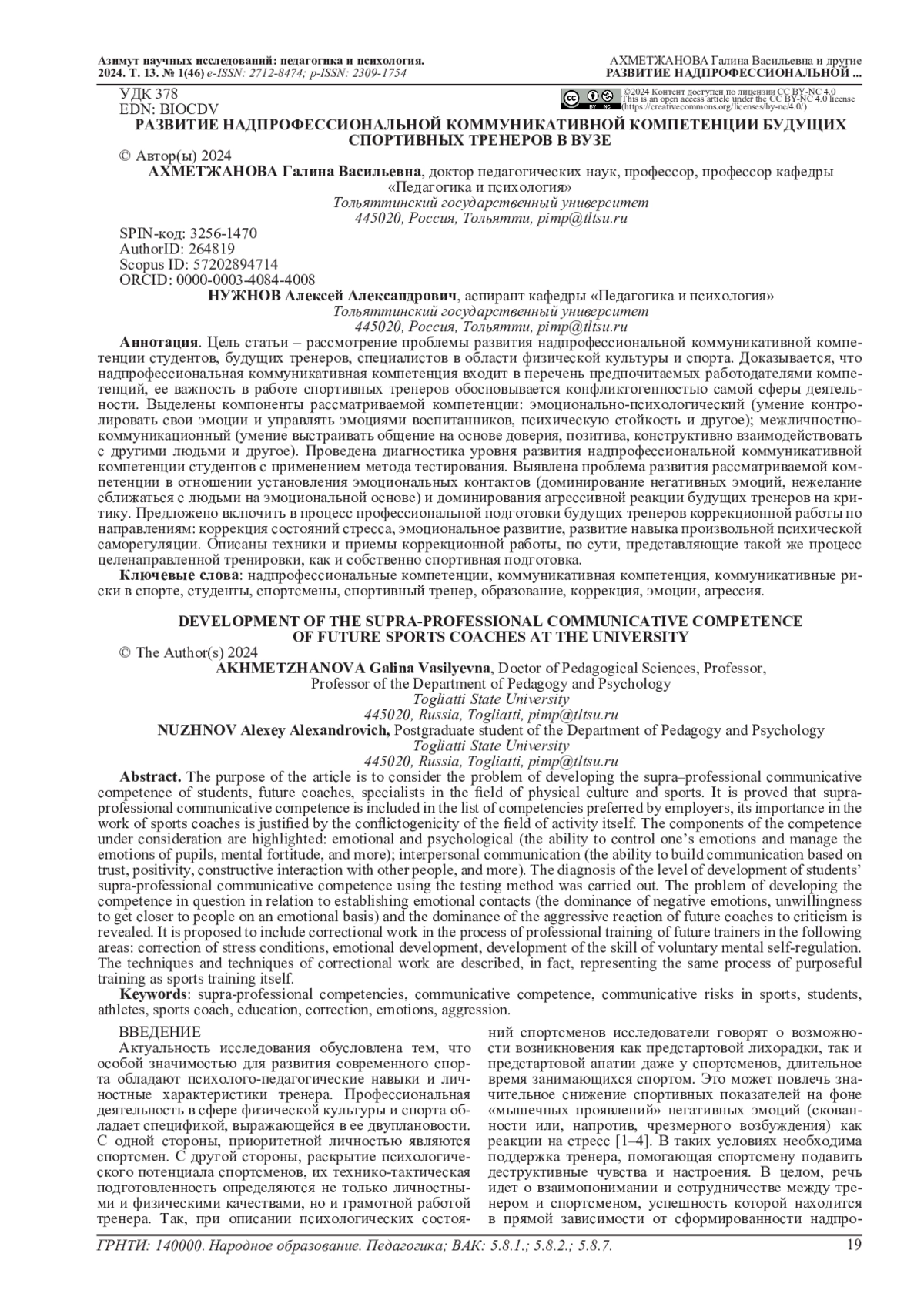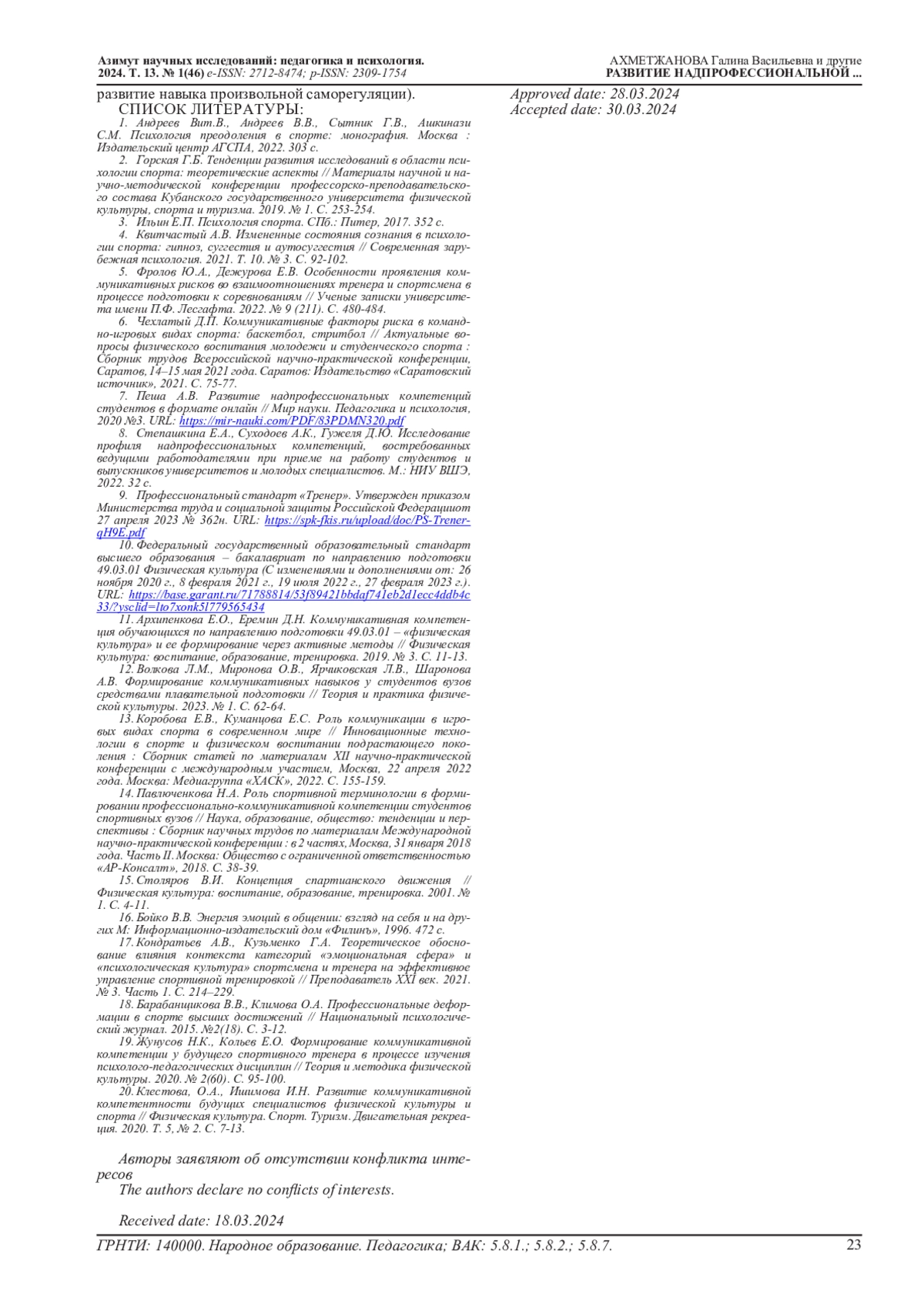 11. Архипенкова Е.О., Еремин Д.Н. Коммуникативная компетенция обучающихся по направлению подготовки 49.03.01 - “физическая культура” и ее формирование через активные методы // Физическая культура: воспитание, образование, тренировка. 2019. № 3. С. 11-13. EDN: ZHCXNB