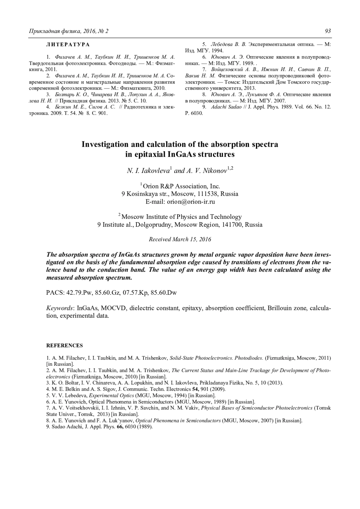N. I. Iakovleva and A. V. Nikonov Investigation and calculation of the absorption spectra in epitaxial InGaAs structures 88