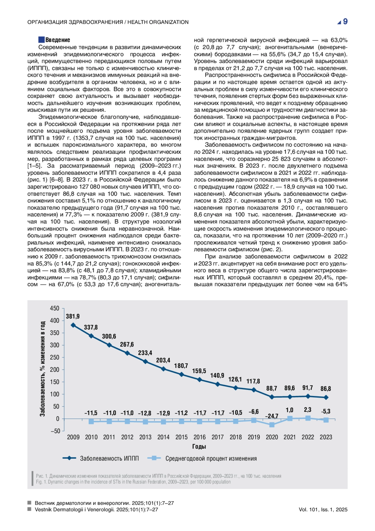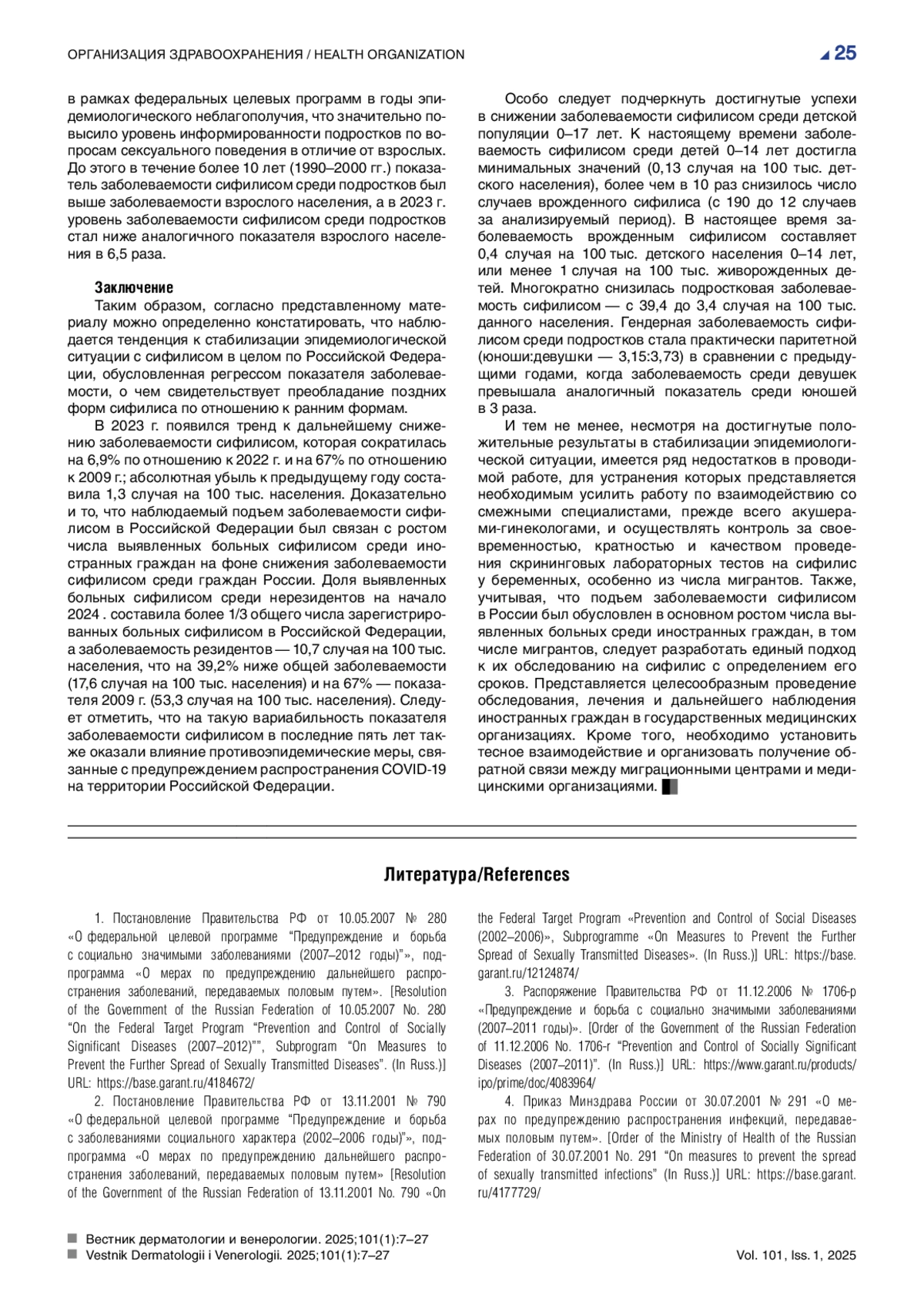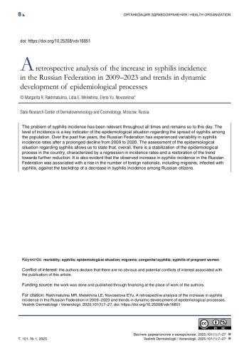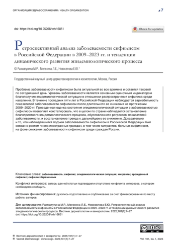 Проблема заболеваемости сифилисом была актуальной во все времена и остается таковой по сегодняшний день. Уровень заболеваемости является основным оценочным индикатором благополучия эпидемиологической ситуации в отношении распространения сифилиса среди населения. В течение последних пяти лет в Российской Федерации наблюдается вариабельность показателей заболеваемости сифилисом после длительного ее снижения на протяжении 2009–2020 гг. Проведенная оценка состояния эпидемиологической ситуации с заболеваемостью сифилисом позволяет констатировать, что в целом по стране наблюдается установление благоприятного эпидемиологического процесса, обусловленного регрессом показателей заболеваемости, и воcстановление тренда к дальнейшему ее снижению. Доказательно и то, что наблюдавшийся подъем заболеваемости сифилисом в Российской Федерации был связан с ростом числа иностранных граждан, в том числе мигрантов, больных сифилисом, на фоне снижения заболеваемости сифилисом среди граждан России.