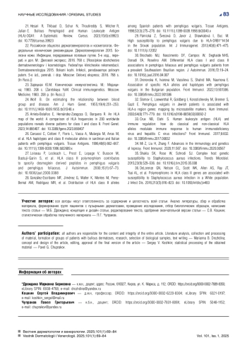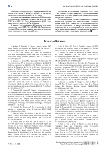 17. Олисова О.Ю., Лепехова А.А., Духанин А.С., Теплюк Н.П., Шимановский Н.Л., и др. Оценка распространенности HLA DRB1 и DRQ1 аллелей у больных разными формами пузырчатки в российской популяции. Российский журнал кожных и венерических болезней. 2024;27(2):143-153. DOI: 10.17816/dv624417