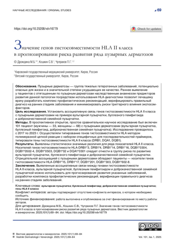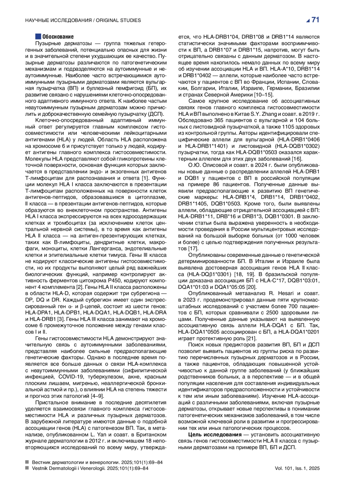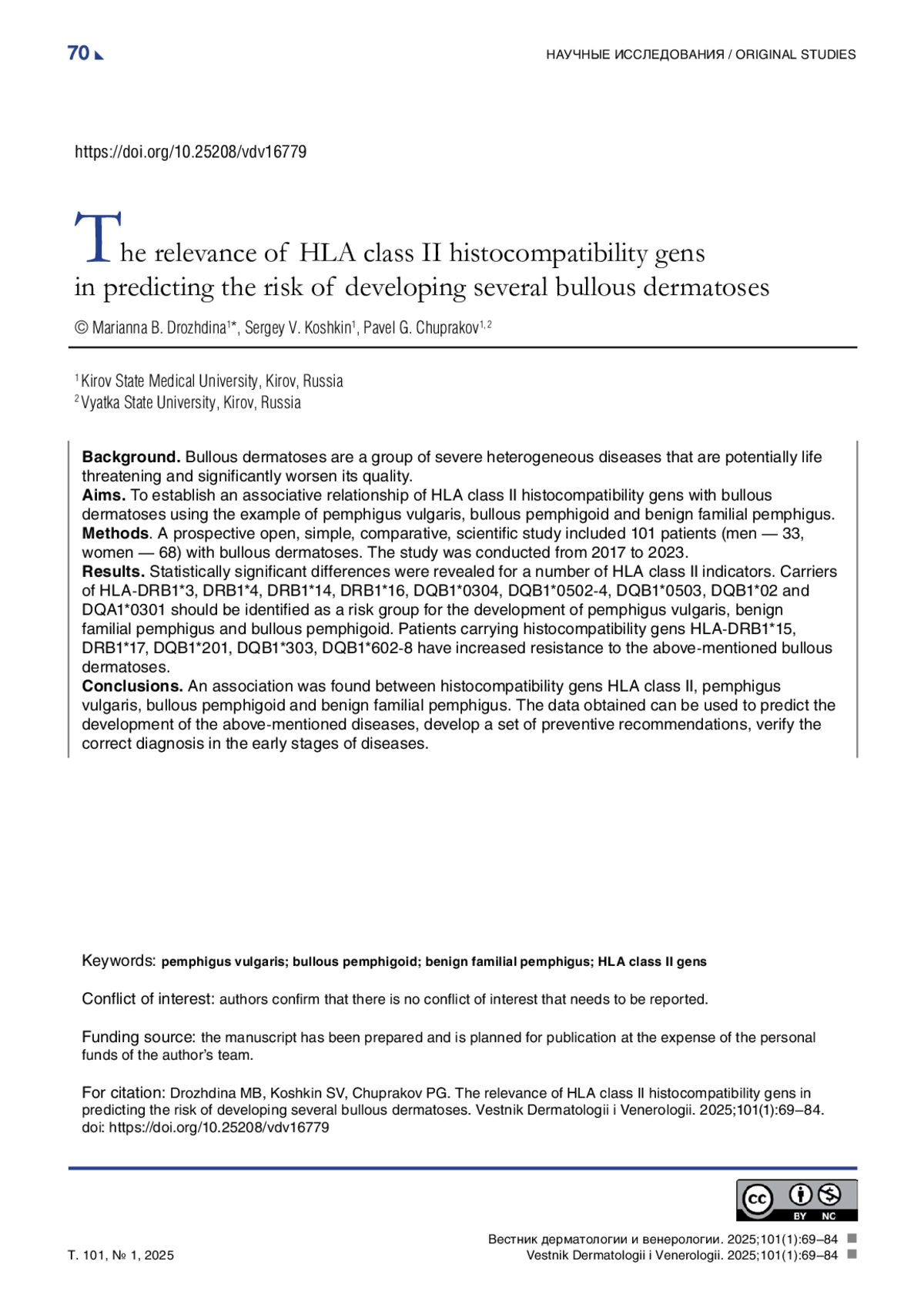 Цель исследования. Установить ассоциативную связь генов гистосовместимости HLA II класса с пузырными дерматозами на примере вульгарной пузырчатки, буллезного пемфигоида и доброкачественной семейной пузырчатки. Методы. В проспективное открытое, простое сравнительное научное исследование был включен 101 пациент (мужчины — 33, женщины — 68) с пузырными дерматозами (вульгарная пузырчатка, буллезный пемфигоид, доброкачественная семейная пузырчатка). Исследование проводилось с 2017 по 2023 г. Осуществляли типирование генов гистосовместимости HLA методом полимеразной цепной реакции с набором специфичных для последовательностей праймеров, типировали гены гистосовместимости HLA II класса (DRB1, DQA1, DQB1).