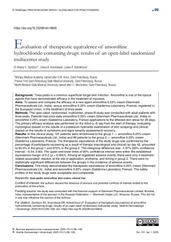 Заключение. Показана терапевтическая эквивалентность препарата аморолфин крем 0,25% («Гленмарк Фармасьютикалз Лтд.», Индия) и препарата аморолфин крем 0,25% («Лаборатории Галдерма», Франция). Профили безопасности препаратов приемлемы и сопоставимы.
