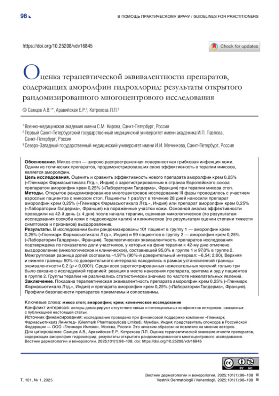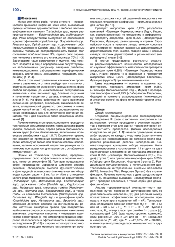 Методы. Открытое рандомизированное многоцентровое исследование III фазы проводилось c участием взрослых пациентов с микозом стоп. Пациенты 1 раз/сут в течение 28 дней наносили препарат аморолфин крем 0,25% («Гленмарк Фармасьютикалз Лтд.», Индия) или препарат аморолфин крем 0,25% («Лаборатории Галдерма», Франция) на пораженные участки кожи. Основной анализ эффективности проводили на 42-й день (± 4 дня) после начала терапии, оценивая микологическое (по результатам исследования соскоба кожи с гидроксидом калия) и клиническое (по результатам оценки степени тяжести симптомов и признаков) выздоровление.