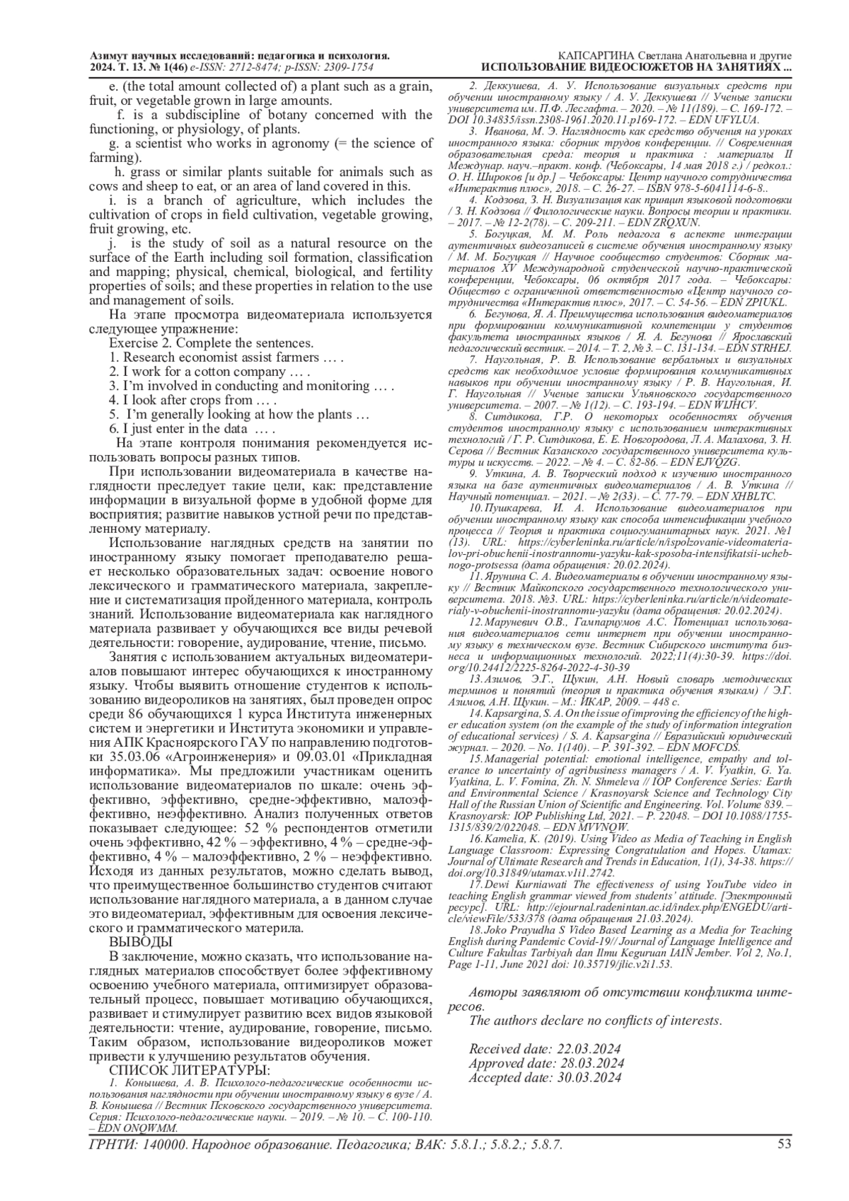 10. Пушкарева, И. А. Использование видеоматериалов при обучении иностранному языку как способа интенсификации учебного процесса // Теория и практика социогуманитарных наук. 2021. №1 (13). URL: https://cyberleninka.ru/article/n/ispolzovanie-videomaterialov-pri-obuchenii-inostrannomu-yazyku-kak-sposoba-intensifikatsii-uchebnogo-protsessa (дата обращения: 20.02.2024). EDN: JYZDDQ
