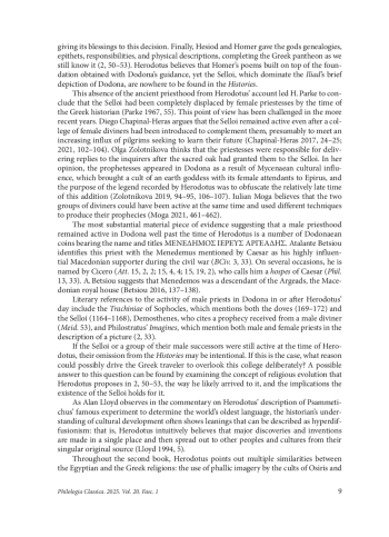 In the second book of the Histories, Herodotus recounts a legend that attributes the establishment of the oracle of Dodona to Egypt’s influence: a more fantastical variant of the tale features a black dove capable of human speech, while a more realistic rendition identifies an abducted Egyptian priestess as the founder. Notably absent from Herodotus’ account are the Selloi, a group of ascetic diviners mentioned in the Iliad’s brief depiction of Dodona, where they are said to sleep on the ground and refrain from washing their feet, presumably to maintain a spiritual connection to earth. This absence of the ancient priesthood from the Histories led some scholars to conclude that the Selloi must have disappeared by the time of Herodotus, fully replaced by a college of priestesses said to derive their sacred knowledge from the Egyptian Thebes. This point of view was challenged lately, as more evidence for the continued presence of male priests in Dodona had been uncovered and cataloged. Hence it seems consequent to suppose that the exclusion of the Selloi from the Histories may have been entirely intentional on Herodotus’ part, since the existence of this college and its acknowledgement in the Iliad could be difficult to reconcile with a theory proposed in the second book, which suggests that Dodona had a foundational role in the early development of the Greek religion as a conductor of the Egyptian influence in the pre-Homeric Greece