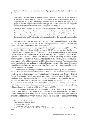 This article examines the testimonia concerning Aeschylus’ purported brothers — Cynegirus and Ameinias — both of whom are said to have distinguished themselves during the Greco-Persian Wars. Cynegirus, a strategos, met a heroic death at the Battle of Marathon, while Ameinias earned renown for his bravery at Salamis. Although modern scholarship widely accepts Cynegirus as Aeschylus’ brother, the earliest extant testimony of their kinship derives from Heraclides of Pontus, later reiterated by an anonymous scholiast on Aristotle’s Nicomachean Ethics. The alleged kinship between Aeschylus and Ameinias, however, remains a subject of debate. This study aligns with the view that their association may stem from later conflation or errors within the ancient historiographical tradition. Regarding Aeschylus and Cynegirus, while Heraclides provides the primary testimony and the subsequent tradition is based on much later sources, their alleged fraternal relationship must be treated with due historiographical caution