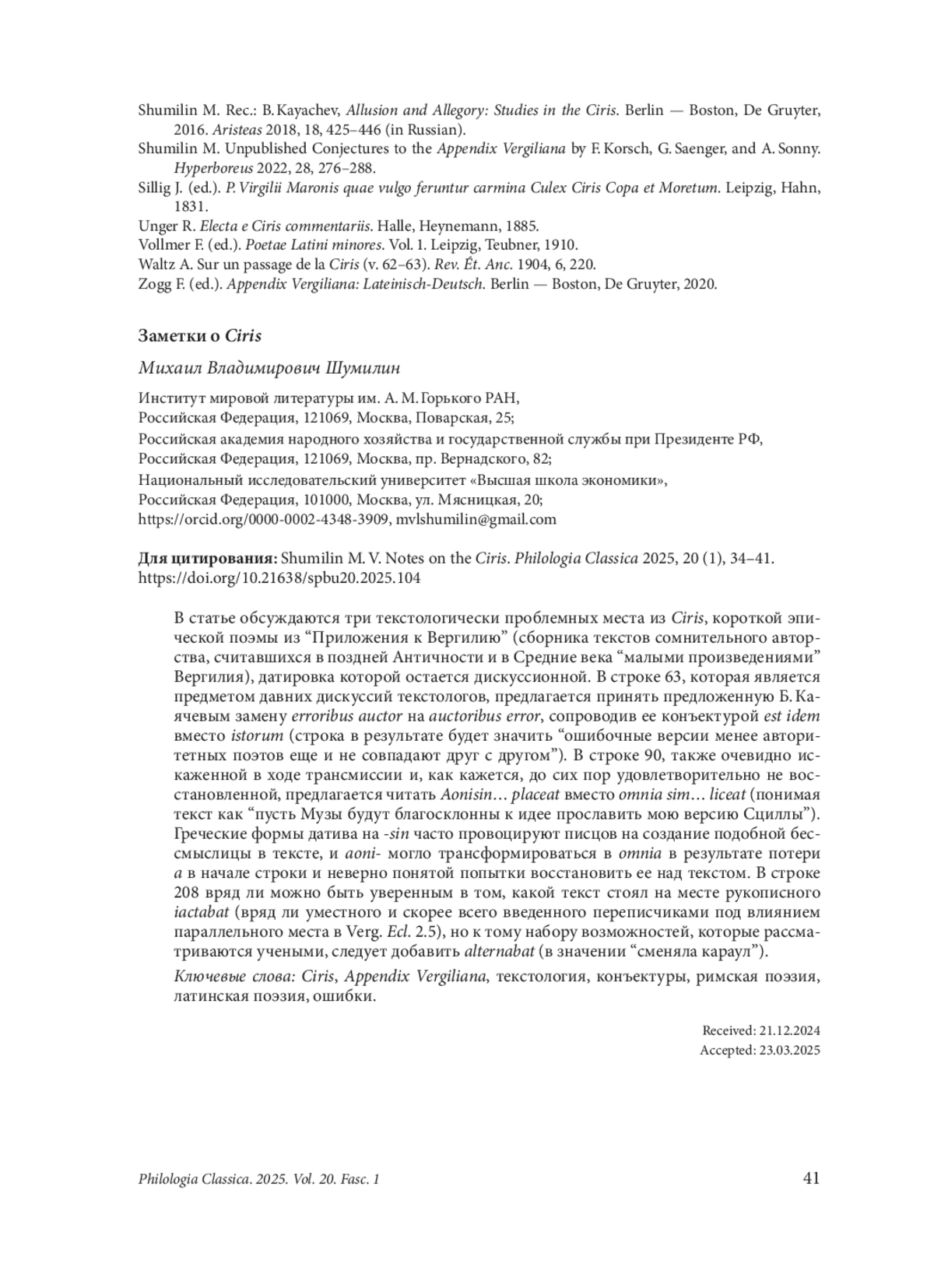 37. Shumilin M. Rec.: B. Kayachev, Allusion and Allegory: Studies in the Ciris. Berlin - Boston, De Gruyter, 2016. Aristeas 2018, 18, 425-446 (in Russian).