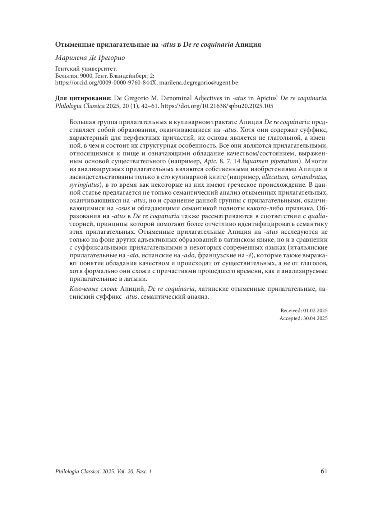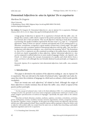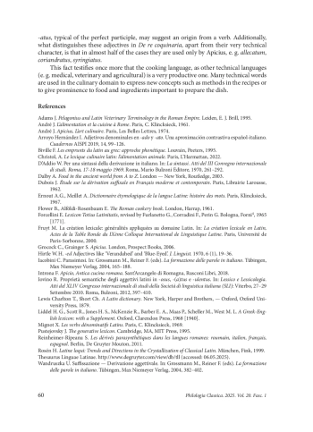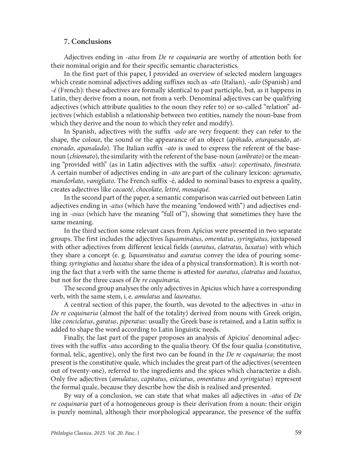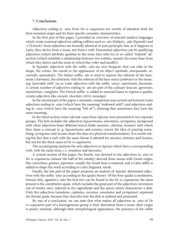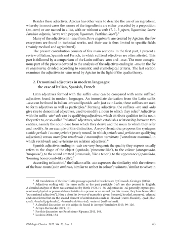 A large group of adjectives in Apicius’ De re coquinaria is formed with the suffix -atus. Although they contain a suffix which is typical of the perfect participle, their base is not verbal, but nominal: this is their peculiarity. They are all adjectives referring to food; their meaning is possessing “the quality/condition expressed by the base-noun” (e. g. Apic. 8. 7. 14 liquamen piperatum). Many of them are Apicius’ creations and attested only in his cooking book (e. g. allecatum, coriandratus, syringiatus); a great number of them have a Greek origin. This paper proposes not only a semantic analysis of denominal adjectives with the suffix -atus, but also a comparison with adjectives ending in -osus, which have the meaning “full of ”. The formations in -atus of De re coquinaria are also examined according to the qualia theory, the principles of which are clearly recognisable in these adjectives. Apicius’ denominal adjectives in -atus can be compared to suffixed adjectives in some modern languages (Italian -ato, Spanish -ado, French -é), which express the concept of possession of a quality, and which derive from a noun, not from a verb, although they are formally identical to past participle, as it happens in Latin