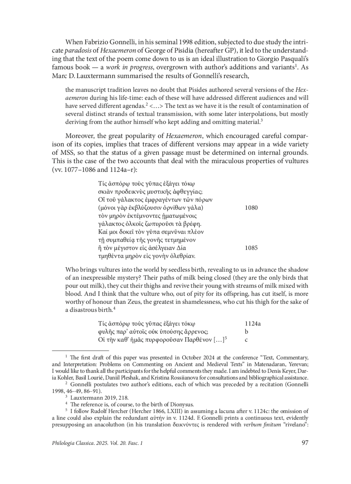 When Fabrizio Gonnelli, in his seminal 1998 edition, subjected to due study the intricate paradosis of Hexaemeron of George of Pisidia (hereafter GP), it led to the understanding that the text of the poem come down to us is an ideal illustration to Giorgio Pasquali’s famous book — a work in progress, overgrown with author’s additions and variants 1. As Marc D. Lauxtermann summarised the results of Gonnelli’s research