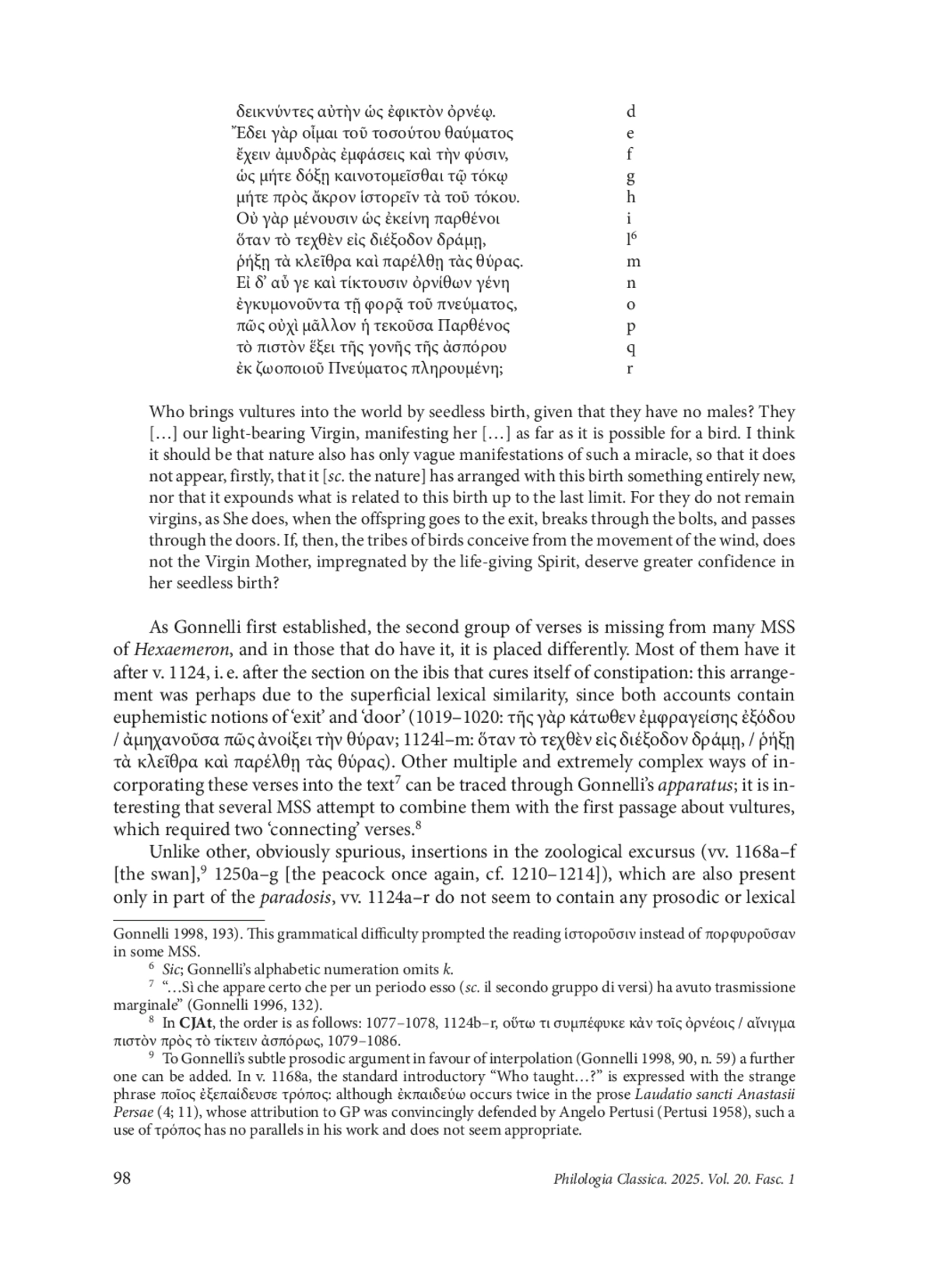 This article continues the series devoted to the study of an extensive zoological excursus in Hexaemeron by George of Pisidia, a 7th-century Byzantine poet. It deals with two accounts of the miraculous properties of vultures which offer their author(s) an opportunity to engage in anti-pagan polemics and to assert the truth of the virgin birth of Jesus (vv. 1077–1086, 1124a–r). The second of these passages is attested only in part of the paradosis, and it is placed differently in different MSS, which indicates that at least for some time it was transmitted in the margins. The question of whether these verses should be considered an interpolation or an author’s variant has been raised twice by Fabrizio Gonnelli, with opposite results. A doxographic commentary on both passages permits a cautious decision for the authenticity of vv. 1124a–r, since it involves a sophisticated and highly original theological development (or even a correction) of a phrase from Homilies in Hexaemeron of Basil the Great (8. 6. 76DE). At the same time, the second passage should be regarded as a later version of the first, since the position of vv. 1077–1086 in the poem seems to point to a hidden polemic with the famous story from Physiologus (ch. 4 of the oldest recension) about the pelican resurrecting its chicks with its own blood; vv. 1124a–r, where nothing is said about vultures feeding their chicks, could not fulfil this role. Incidentally, two unnoticed quotations from Hexaemeron are identified, namely in the scholia recentiora to Aristophanes’ Plutus (v. 63i Chantry) and in the anonymous Byzantine text Παράδειγμα περὶ τοῦ ἀλέκτορος
