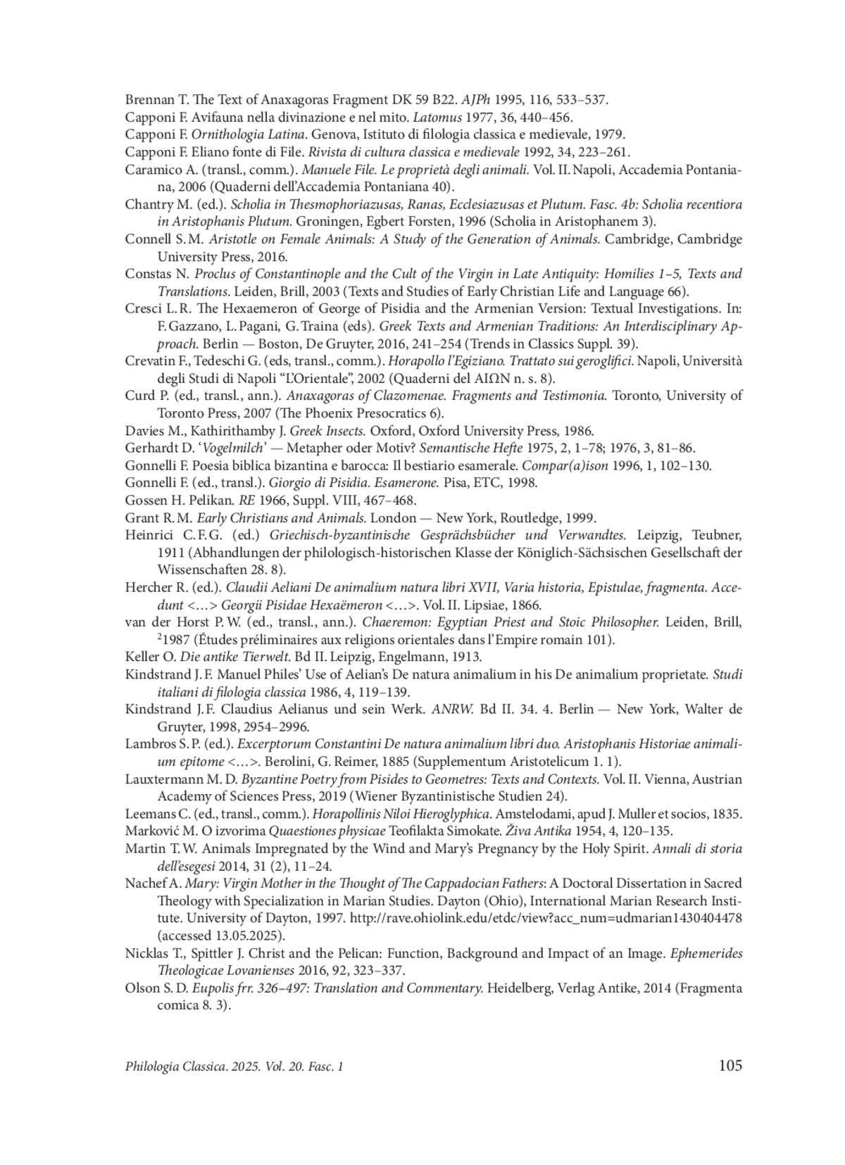 9. Caramico A. (transl., comm.). Manuele File. Le proprietà degli animali. Vol. II. Napoli, Accademia Pontaniana, 2006 (Quaderni dell’Accademia Pontaniana 40).