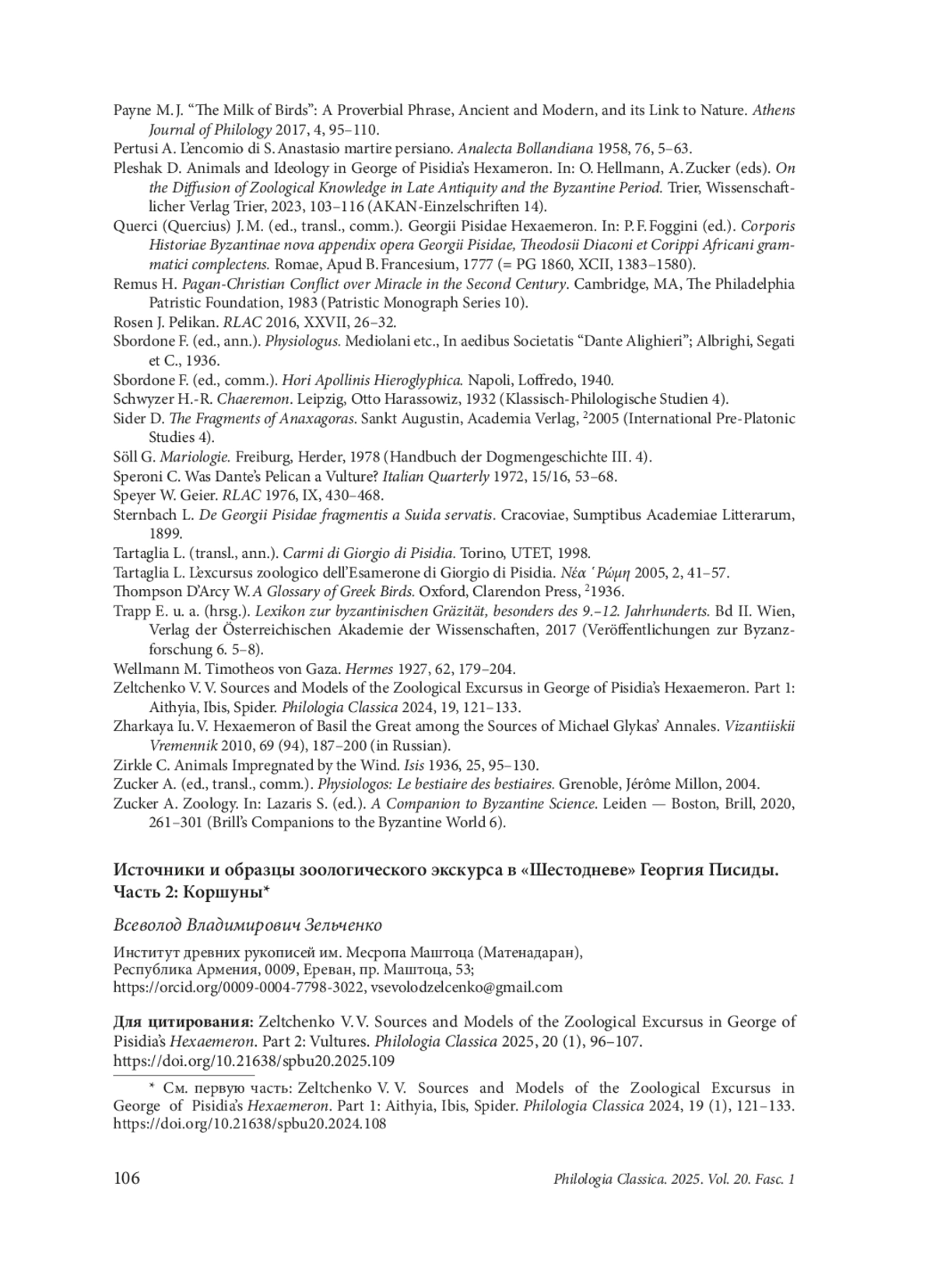 55. Zeltchenko V. V. Sources and Models of the Zoological Excursus in George of Pisidia’s Hexaemeron. Part 1: Aithyia, Ibis, Spider. Philologia Classica 2024, 19, 121-133. EDN: RHWHEI