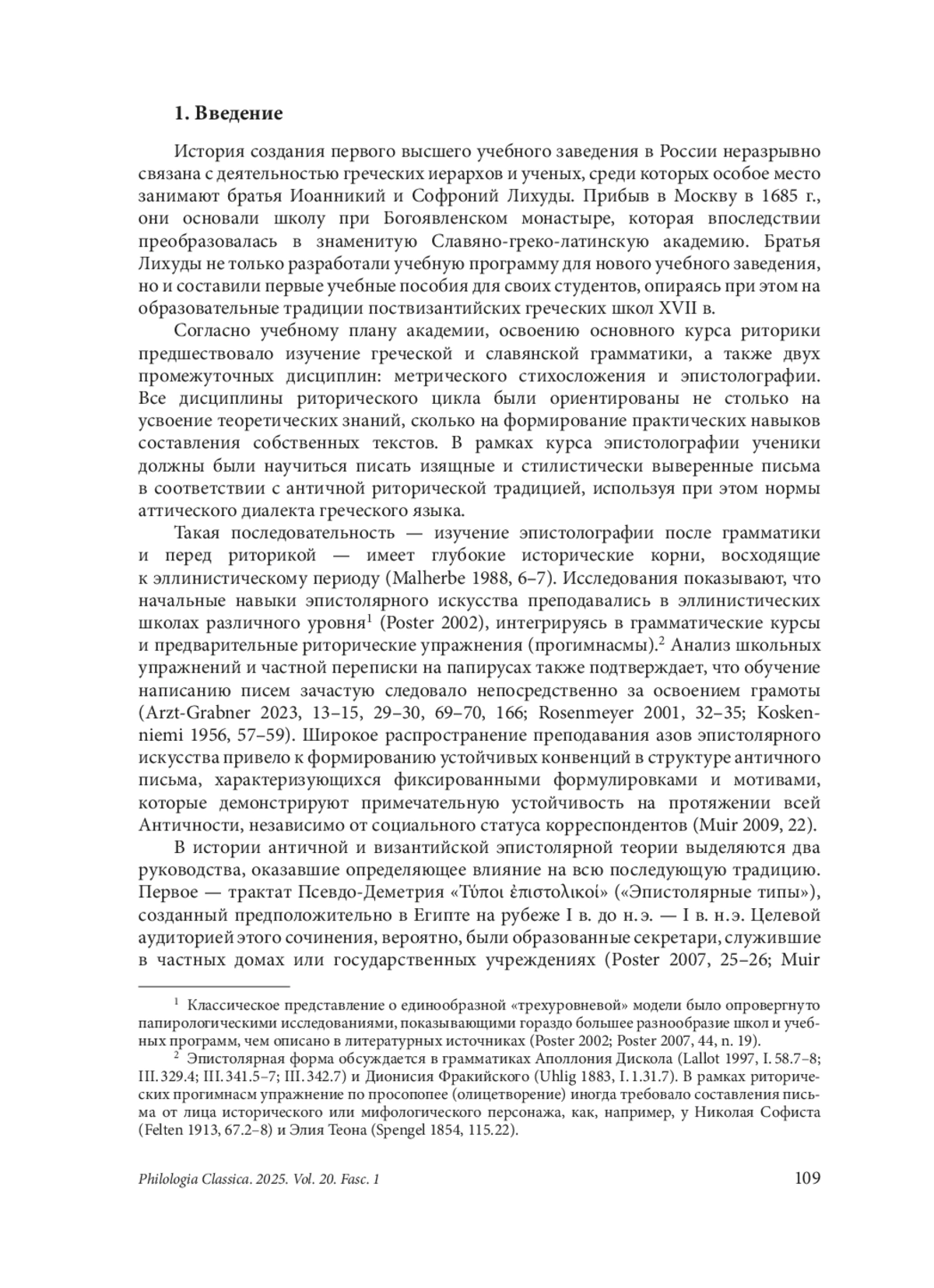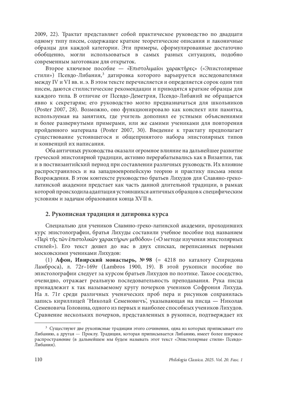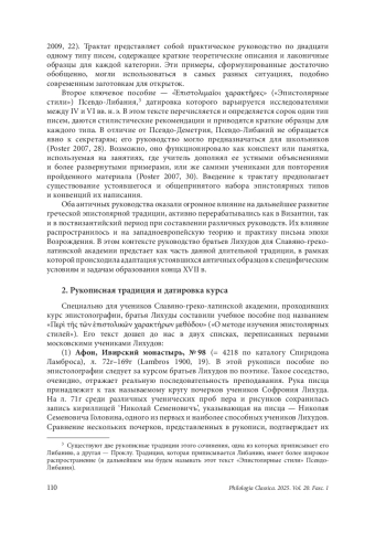 Статья посвящена исследованию неопубликованного учебного пособия по искусству написания писем «О методе изучения эпистолярных стилей» (Περὶ τῆς τῶν ἐπιστολικῶν χαρακτήρων μεθόδου), составленного братьями Иоанникием и Софронием Лихудами для учеников Славяно-греко-латинской академии в конце XVII в. Данное руководство, текст которого сохранился в двух рукописных копиях, выполненных учениками Лихудов (Афон, Ивирский монастырь, No 98 и Санкт-Петербург, Российская национальная библиотека, ф. 906, No 506), представляет собой первый известный систематический курс по теории и практике эпистолографии в России. В статье проводится анализ руко - писной традиции пособия, устанавливается дата его создания (июнь 1687 г.) и обосновывается атрибуция сохранившихся списков первым ученикам Лихудов — Николаю Семеновичу Головину и Федору Герасимовичу Полетаеву. Определено место данного руководства в учебном плане академии как промежуточного курса, изучавшегося после грамматики и перед риторикой, что соответствовало как античной, так и поствизантийской образовательной парадигме. Исследование рассматривает античные прототипы руководства Лихудов — «Эпистолярные типы» Псевдо-Деметрия и «Эпистолярные стили» Псевдо-Либания — и прослеживает их значительное влияние на структуру и содержание пособия. Сочинение Лихудов также анализируется в контексте развития греческой и западноевропейской эпистолярной теории XVII в., выявляются его общие черты с другими современными пособиями и его специфические особенности. Особое внимание уделяется структуре руководства, включающей теоретическое введение в форме вопросов и ответов, и обсуждению ключевых эпистолографических концепций (определение письма, формулы приветствия и прощания, структура, стиль, датировка, титулование). Статья сопровождается критическим изданием греческого текста теоретического введения к сочинению Лихудов и его русским переводом