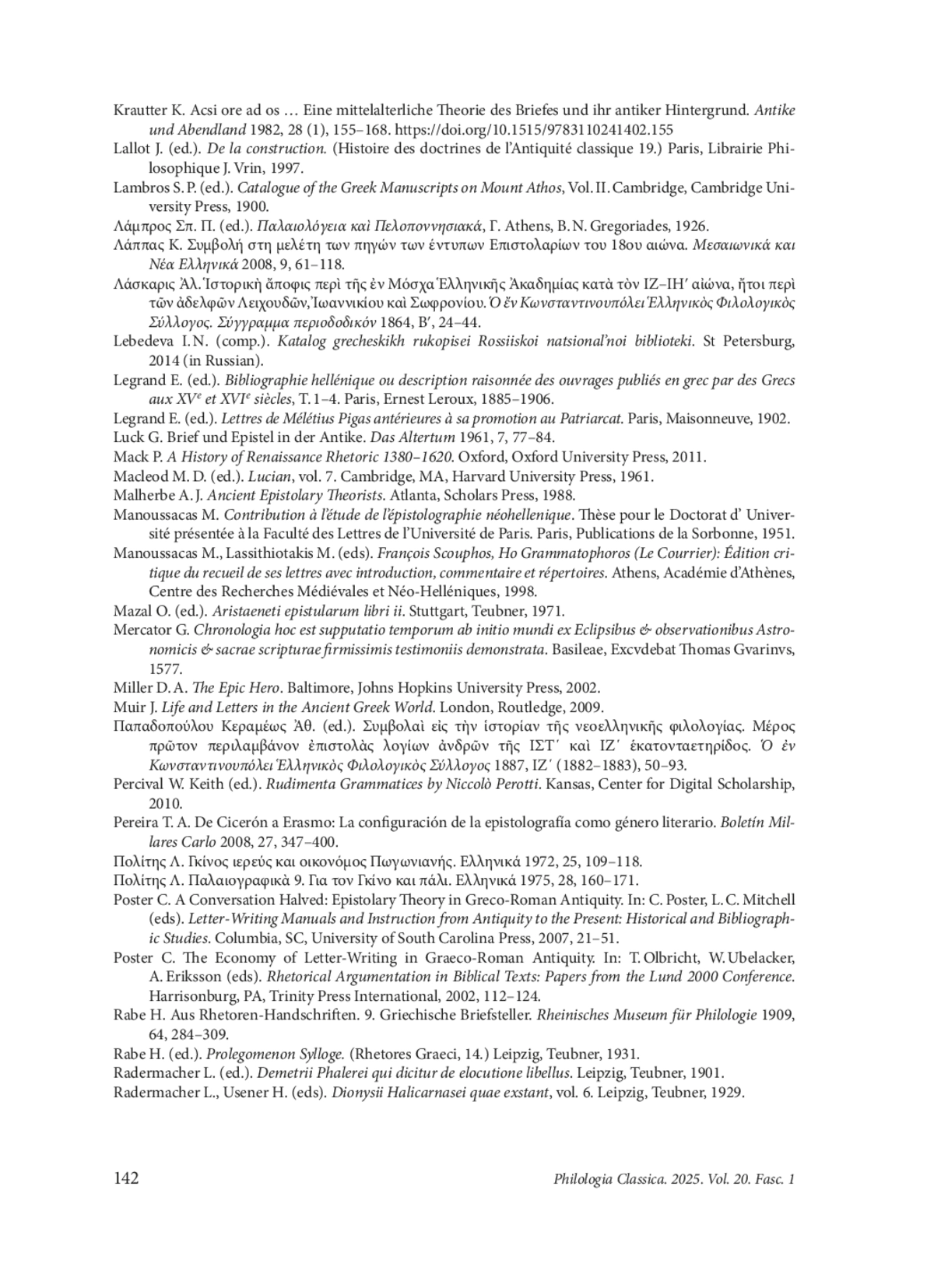 60. Poster C. A Conversation Halved: Epistolary Theory in Greco-Roman Antiquity. In: C. Poster, L. C. Mitchell (eds). Letter-Writing Manuals and Instruction from Antiquity to the Present: Historical and Bibliographic Studies. Columbia, SC, University of South Carolina Press, 2007, 21-51.