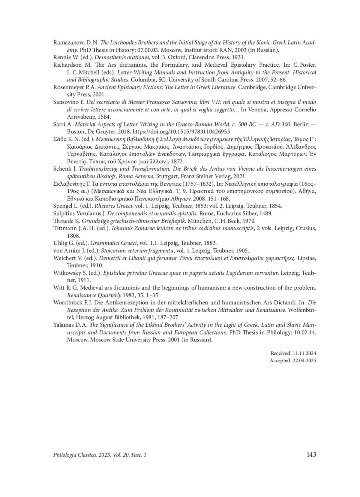 3. Черноглазов Д. А. Кого цитирует Феофил Коридалевс? Замечания о греческом Письмовнике XVII века. Индоевропейское языкознание и классическая филология 2019, 23 (2), 1103-1115. DOI: 10.30842/ielcp230690152383 EDN: HJANNF