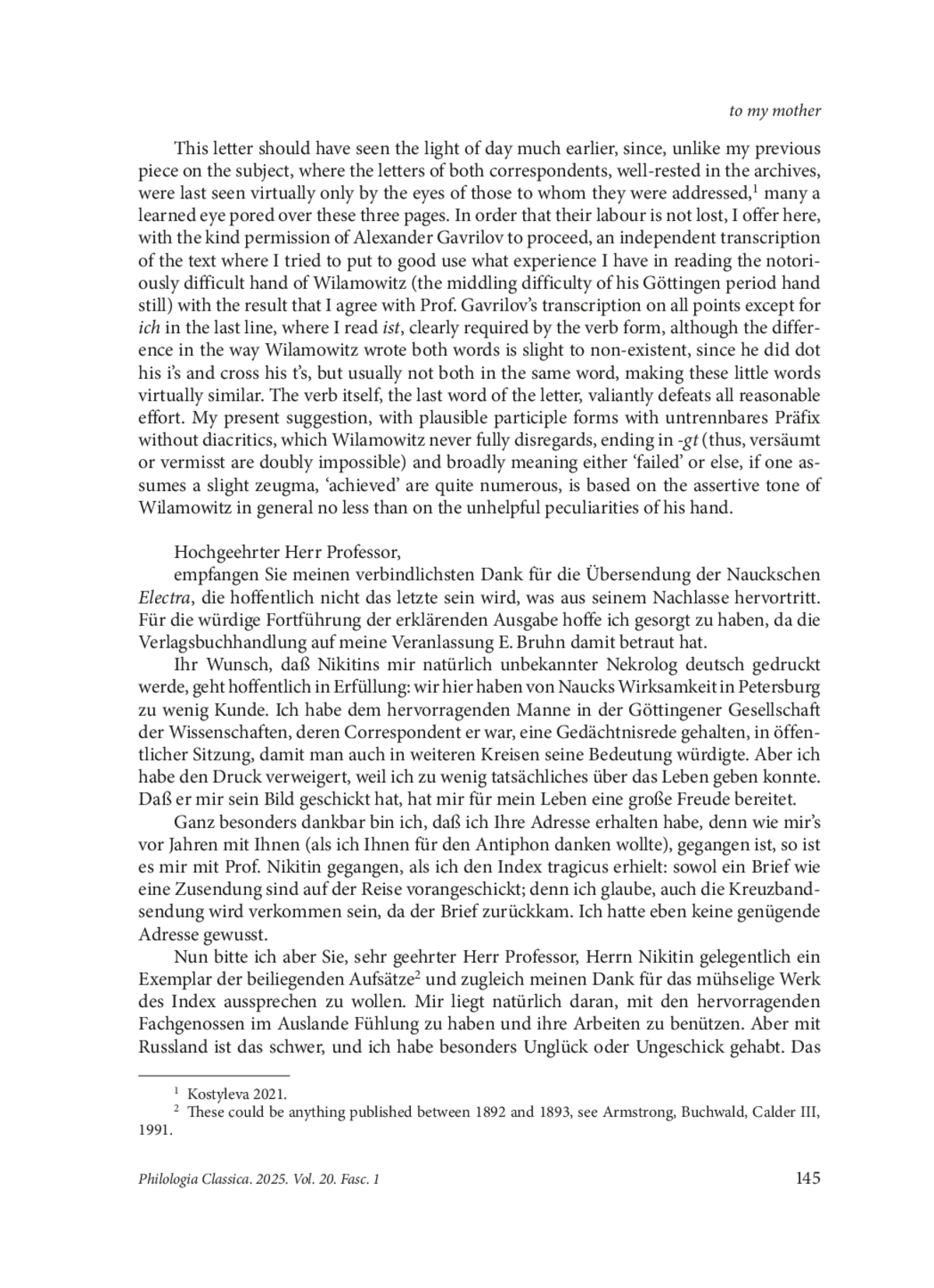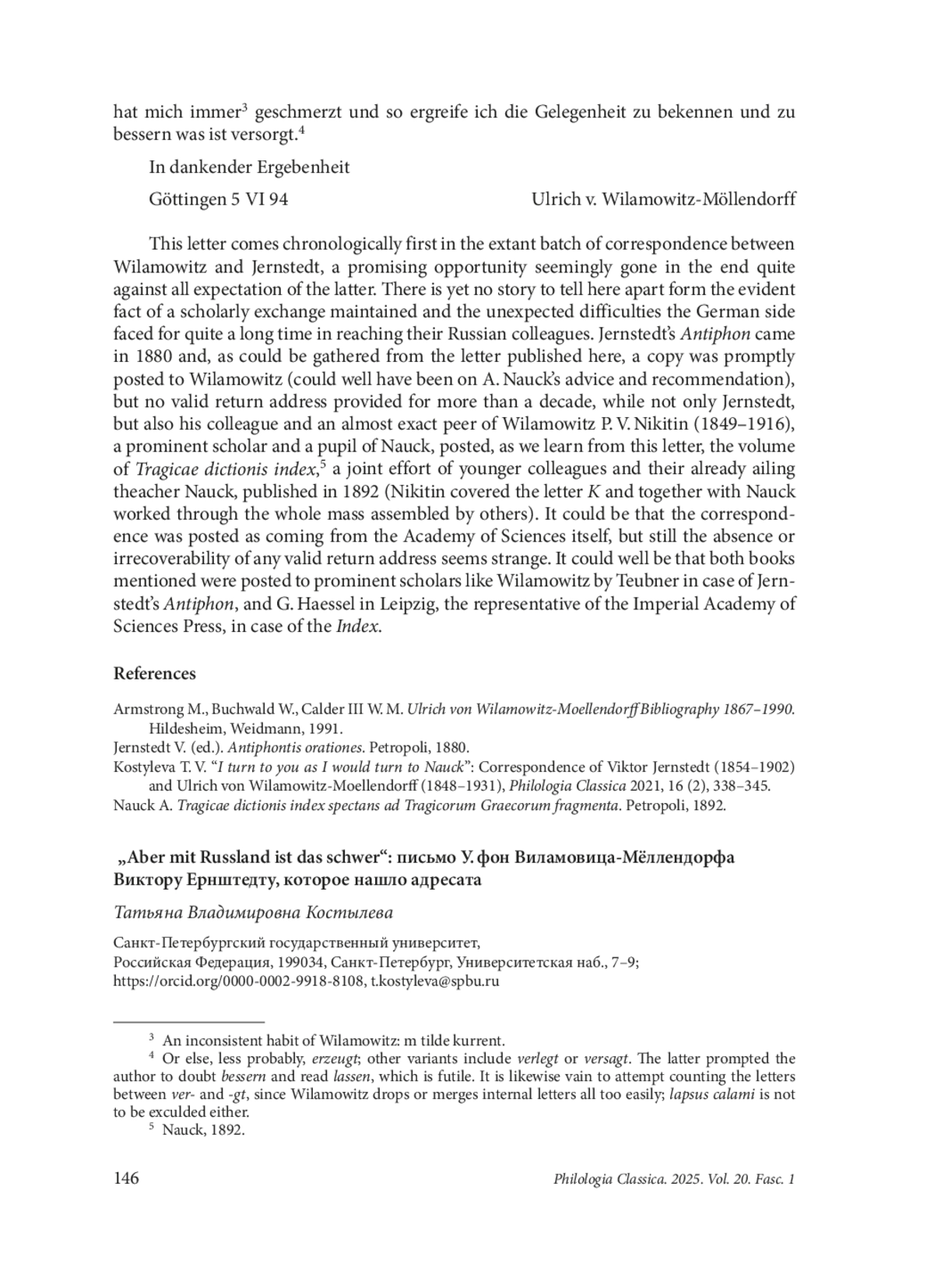 This article fills the gap in the extant published correspondence of Ulrich von WilamowitzMoellendorff (1848–1931) and Victor Jernstedt (1854–1902). This time only Wilamowitz’ letter from 5 th June 1894 survives, housed in the St Petersburg Branch of the Archive of the Russian Academy of Sciences, and it is not clear whether an immediate answer in the eventually established correspondence followed; in all likelihood, it could have, although no trace or evidence of its existence was found by the author in the Archive of Niedersächsische Staatsund Universitätsbibliothek Göttingen back in the summer of 2021. A handwritten piece of three pages, with shelfmark call number 733.2.44.1r–2r, is a belated thank-you letter for the volume of Euripides’ Electra, edited by August Nauck (1822–1892) and posthumously published in 1893. It was seen through the press by Jernstedt himself and posted to Wilamowitz some time in late 1893 or early 1894, but somehow without any valid return address. A fresh transcription published here, while in agreement with the one made by Alexander Gavrilov, attempts to solve the problem the last word of the letter has presented ever since it was first trabscribed decades ago. A brief discussion of variants discarded follows. Since the decision taken is tentative, the images of the letter are attached in three plates, for the reader to try their hand and eye