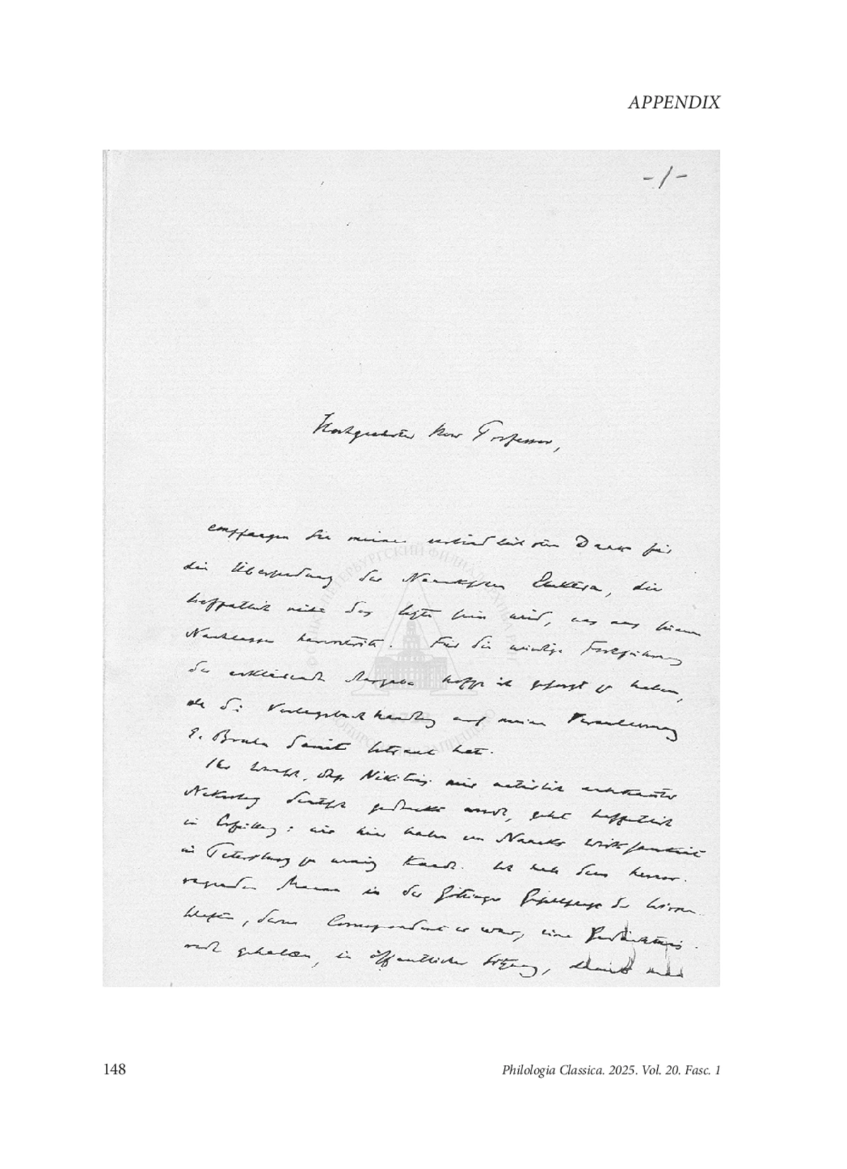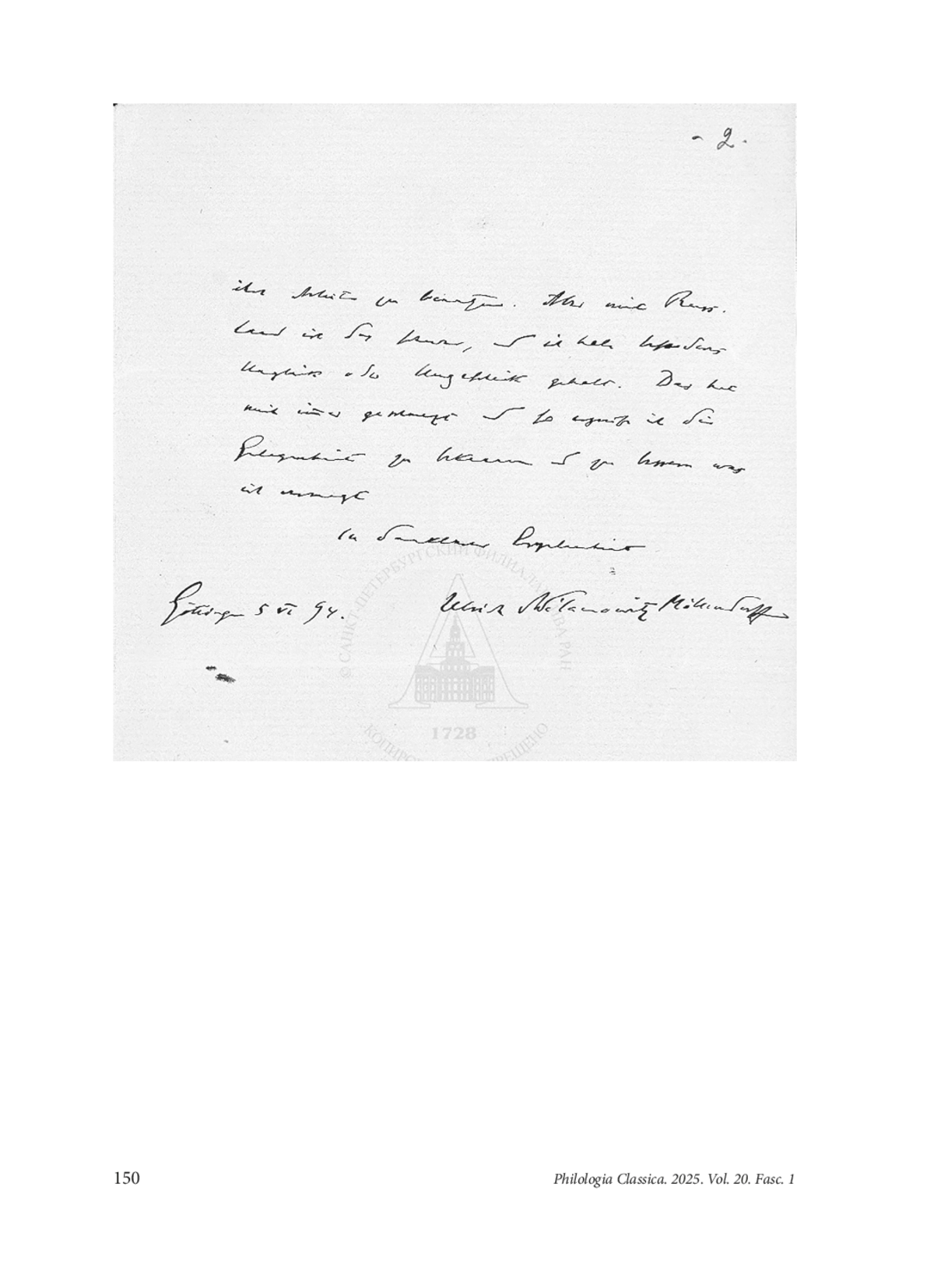 This letter should have seen the light of day much earlier, since, unlike my previous piece on the subject, where the letters of both correspondents, well-rested in the archives, were last seen virtually only by the eyes of those to whom they were addressed,1 many a learned eye pored over these three pages. In order that their labour is not lost, I offer here, with the kind permission of Alexander Gavrilov to proceed, an independent transcription of the text where I tried to put to good use what experience I have in reading the notoriously difficult hand of Wilamowitz (the middling difficulty of his Göttingen period hand still) with the result that I agree with Prof. Gavrilov’s transcription on all points except for ich in the last line, where I read ist, clearly required by the verb form, although the difference in the way Wilamowitz wrote both words is slight to non-existent, since he did dot his i’s and cross his t’s, but usually not both in the same word, making these little words virtually similar. The verb itself, the last word of the letter, valiantly defeats all reasonable effort. My present suggestion, with plausible participle forms with untrennbares Präfix without diacritics, which Wilamowitz never fully disregards, ending in -gt (thus, versäumt or vermisst are doubly impossible) and broadly meaning either ‘failed’ or else, if one assumes a slight zeugma, ‘achieved’ are quite numerous, is based on the assertive tone of Wilamowitz in general no less than on the unhelpful peculiarities of his hand