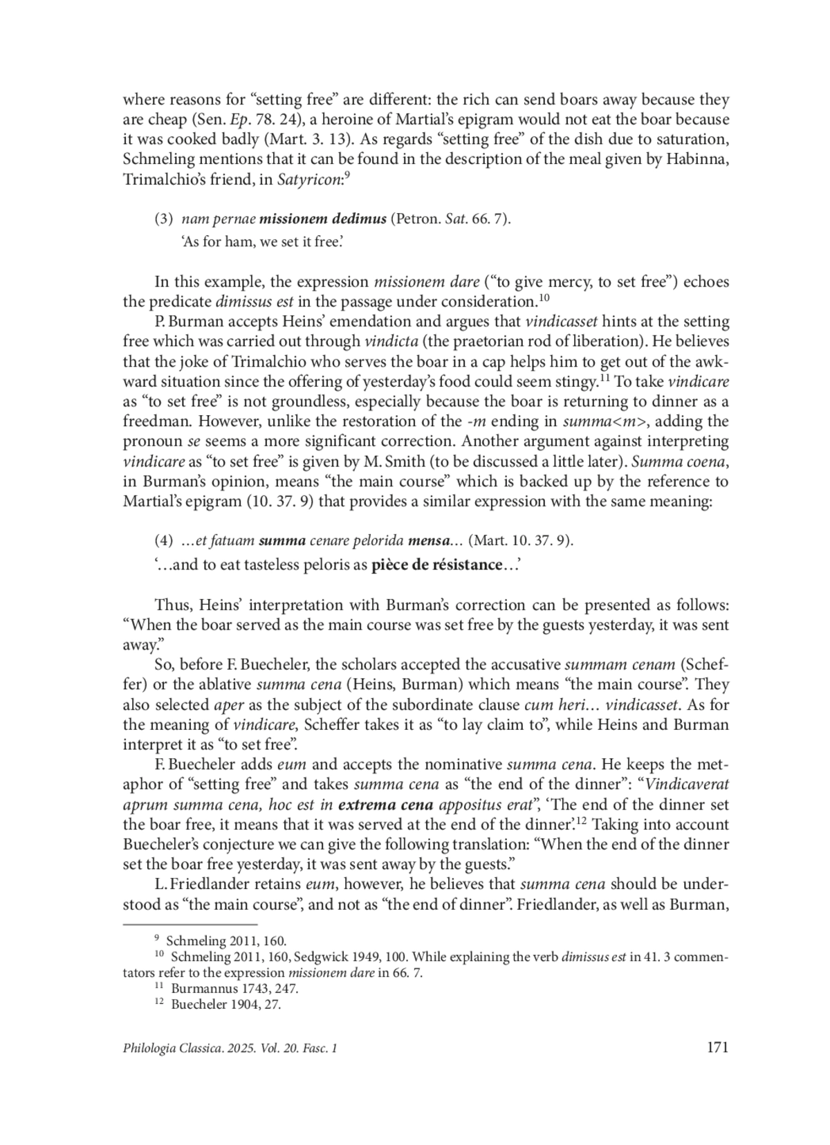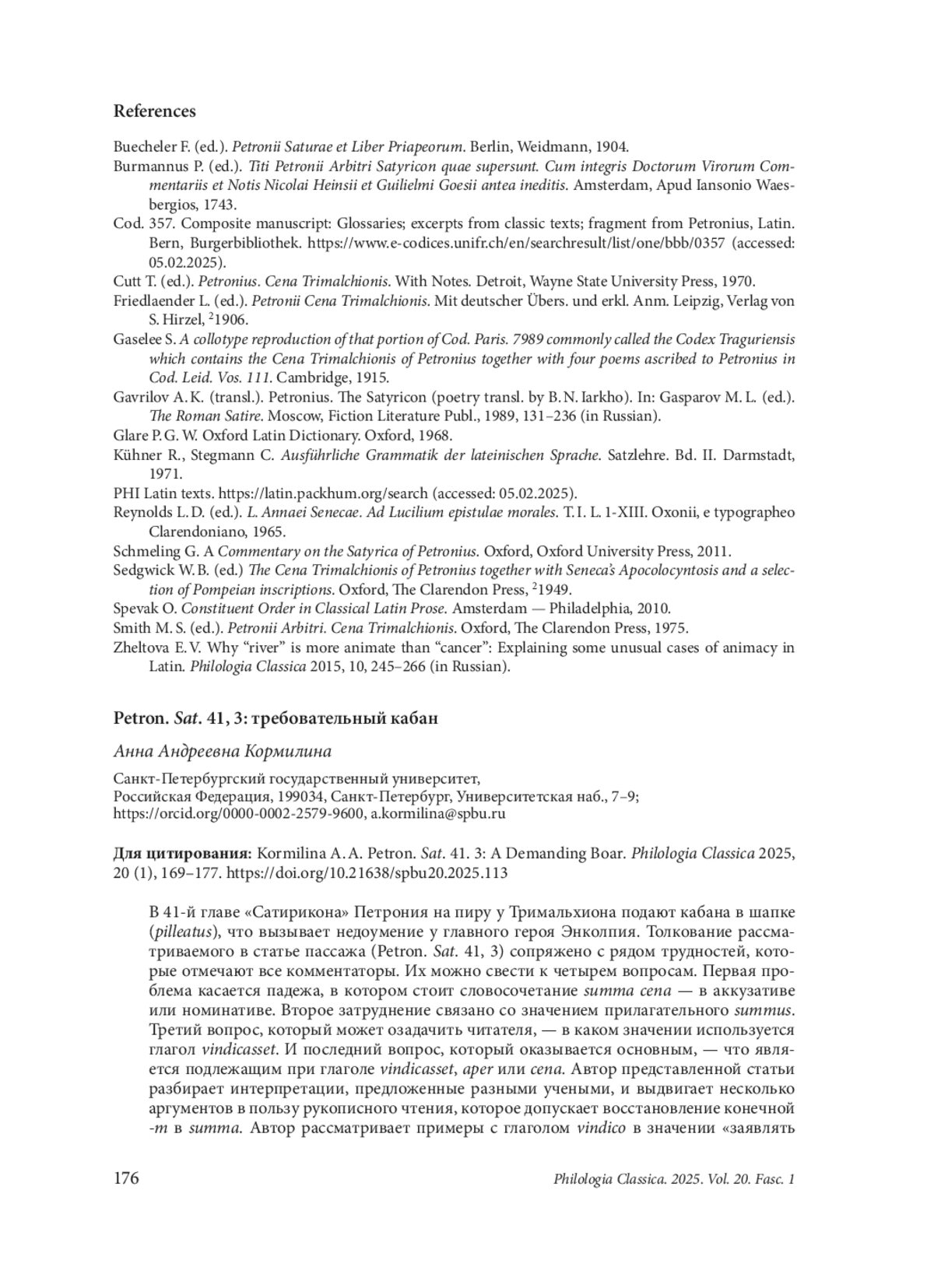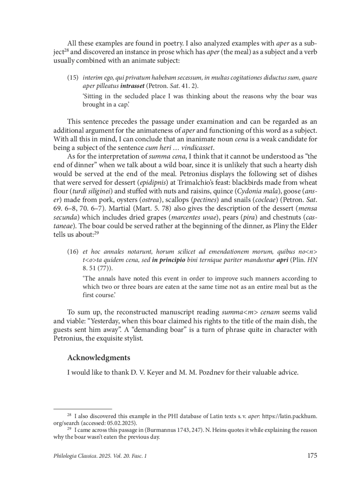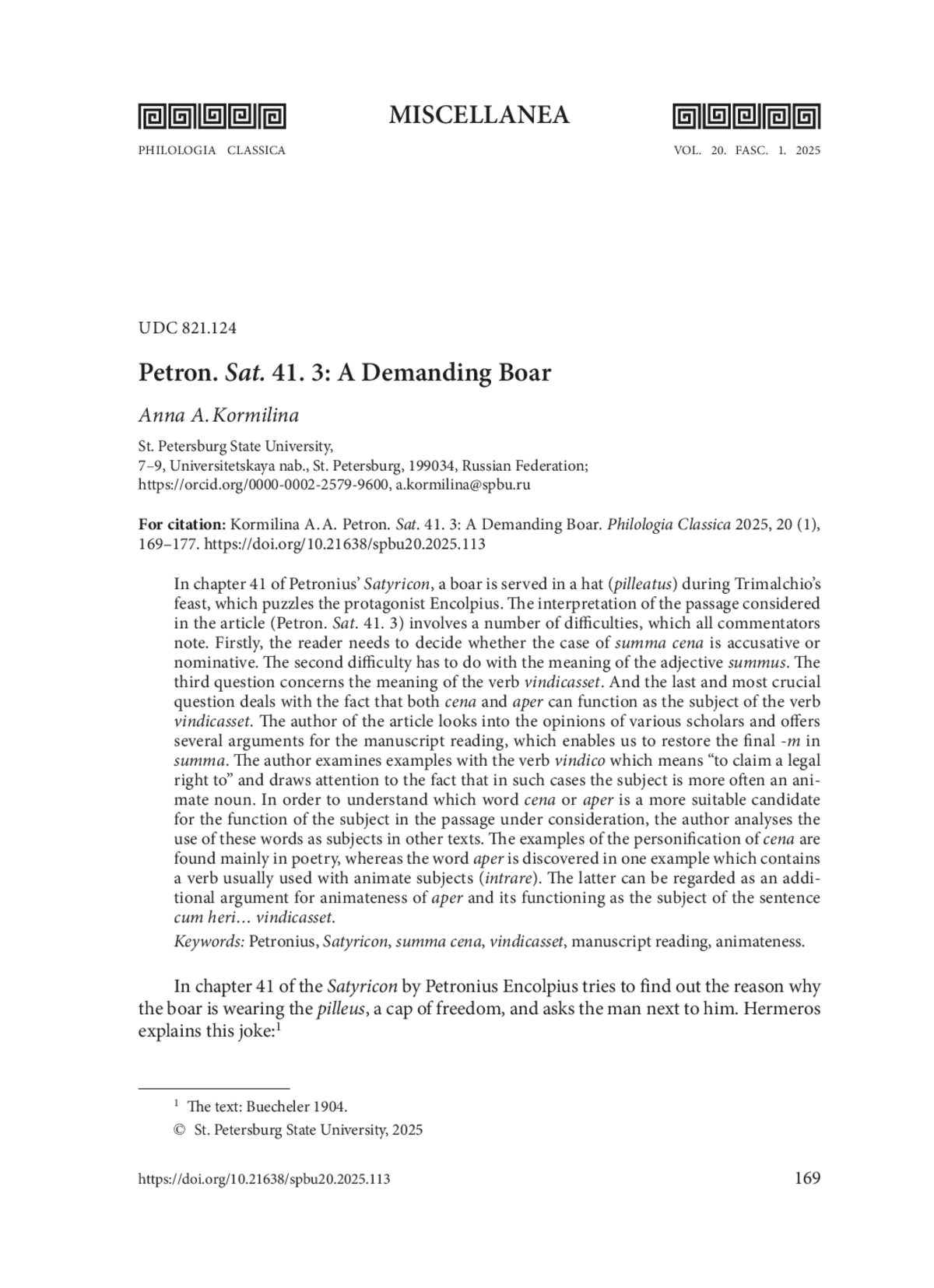 In chapter 41 of Petronius’ Satyricon, a boar is served in a hat (pilleatus) during Trimalchio’s feast, which puzzles the protagonist Encolpius. The interpretation of the passage considered in the article (Petron. Sat. 41. 3) involves a number of difficulties, which all commentators note. Firstly, the reader needs to decide whether the case of summa cena is accusative or nominative. The second difficulty has to do with the meaning of the adjective summus. The third question concerns the meaning of the verb vindicasset. And the last and most crucial question deals with the fact that both cena and aper can function as the subject of the verb vindicasset. The author of the article looks into the opinions of various scholars and offers several arguments for the manuscript reading, which enables us to restore the final -m in summa. The author examines examples with the verb vindico which means “to claim a legal right to” and draws attention to the fact that in such cases the subject is more often an animate noun. In order to understand which word cena or aper is a more suitable candidate for the function of the subject in the passage under consideration, the author analyses the use of these words as subjects in other texts. The examples of the personification of cena are found mainly in poetry, whereas the word aper is discovered in one example which contains a verb usually used with animate subjects (intrare). The latter can be regarded as an additional argument for animateness of aper and its functioning as the subject of the sentence cum heri… vindicasset