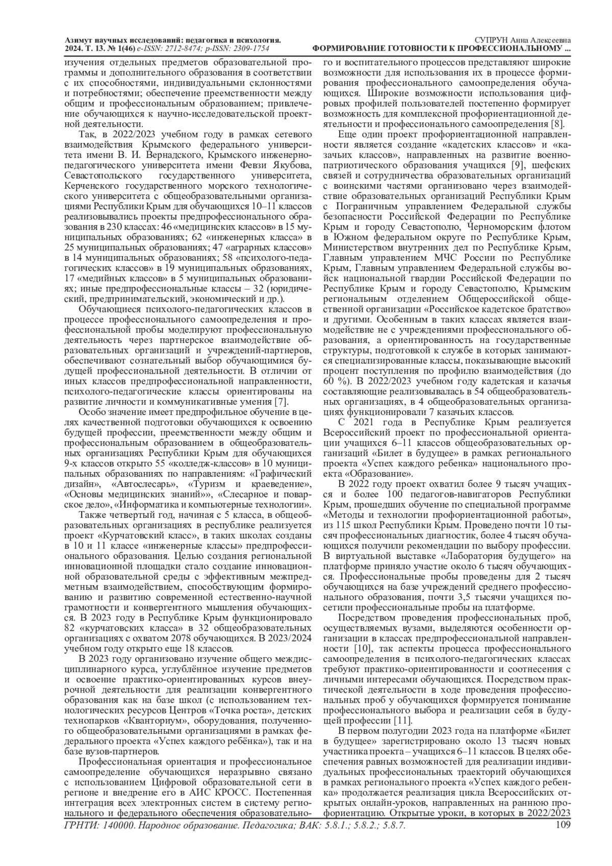 Научная новизна: в статье впервые рассмотрена профориентационная деятельность в общеобразовательных организациях Республики Крым через организованное взаимодействие всех партнеров по сопровождению профессионального самоопределения обучающихся в условиях профориентационного минимума и с акцентом на «психолого-педагогические классы» в старшей профильной школе.