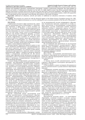 Цель статьи: исследование дополнительного художественного образования как инструмента личностного развития и фактора формирования городского культурного пространства. Для изучения студий дополнительного художественного образования как фактора формирования культурного пространства города был проведен анализ интернет-контента Краснодара с целью выявить, какие услуги они предлагают потенциальным учащимся, как описывают свои основные особенности и подчеркивают уникальность и, в целом, как позиционируют свое место в культурном ландшафте города. Для выявления особенностей образовательного процесса взрослых был использован метод глубинного интервью с педагогами студий дополнительного художественного образования при помощи авторского опросника. Результаты исследования интернет-контента показали, что школы и студии дополнительного художественного образования Краснодара выполняют целый ряд функций: собственно образовательную, досуговую, культурно-просветительскую, коммуникативную и самореализации. На основании анализа материала глубинных интервью педагогов дополнительного художественного образования был выделен ряд ведущих мотивов обучающихся: релаксационный, коммуникативный, терапевтический, познавательный, профессиональный, ситуативный. В качестве основной проблемы школ и студий дополнительного художественного образования было выделено отсутствие единого цифрового ресурса, позволяющего потенциальным обучающимся с разной мотивацией быстро найти именно то место, которое соответствует его целям, запросам и возможностям. Данный цифровой инструмент будет способствовать установлению горизонтальных связей между структурами дополнительного художественного образования и потенциальными учащимися, что позволит расширить данную сферу образовательных услуг и сделать ее более гибкой и чувствительной к потребностям обучающихся.