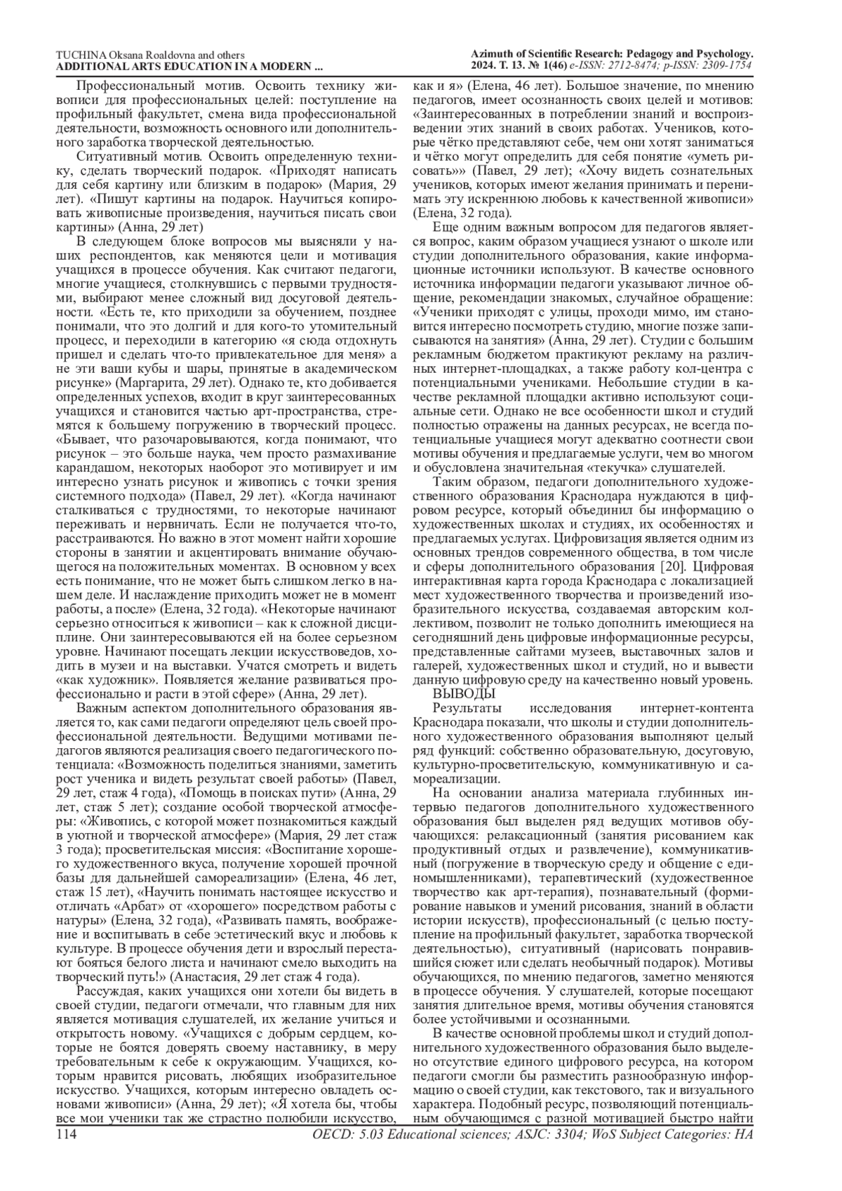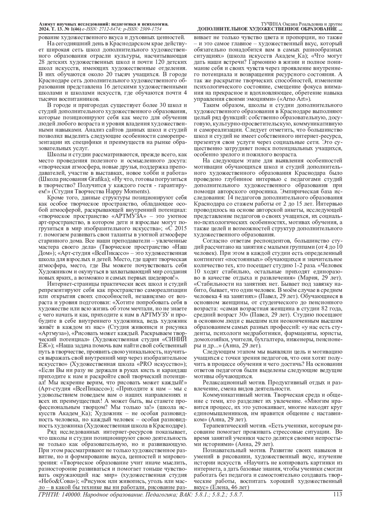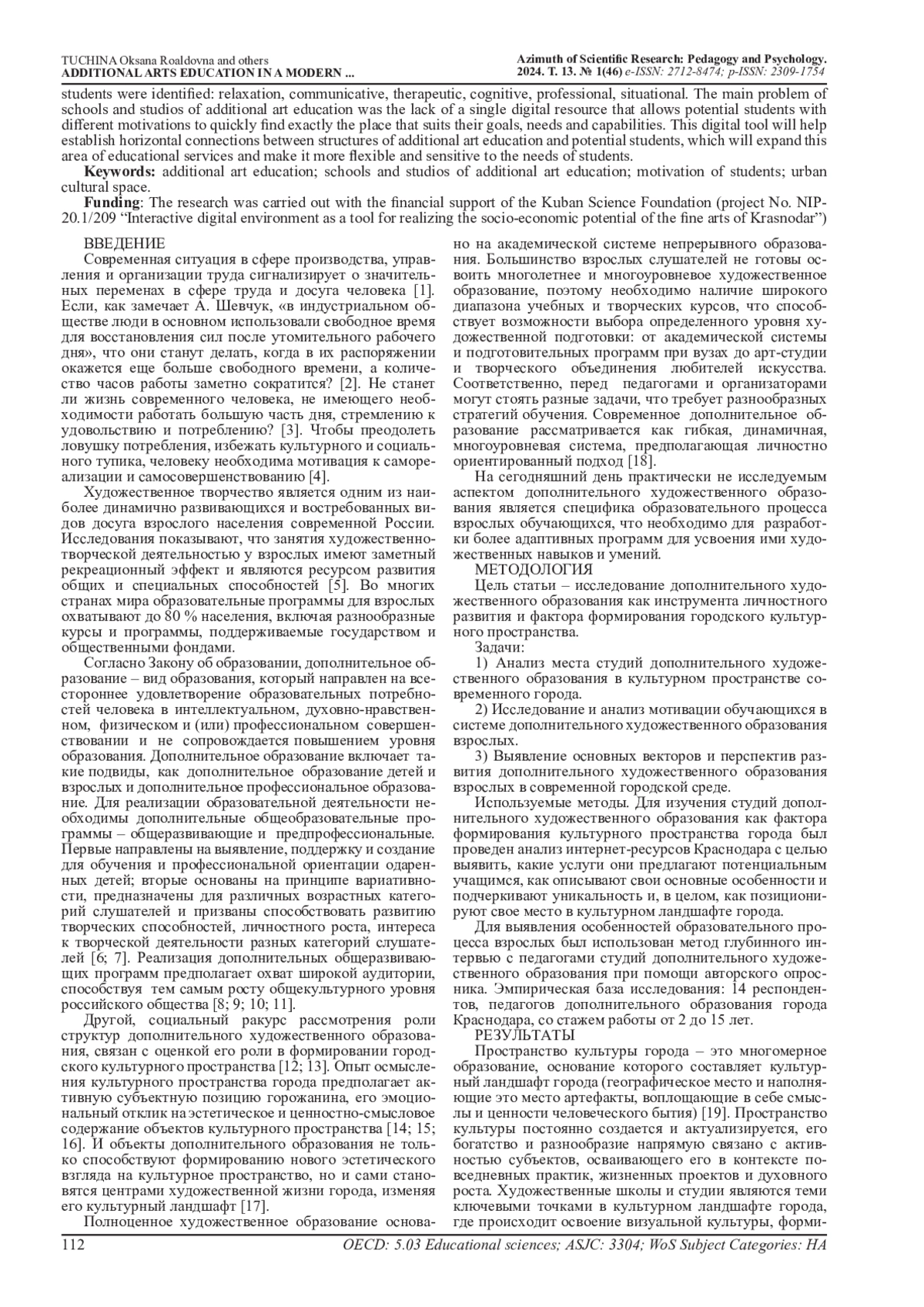 11. Осипова М.Б. Современное дополнительное художественное образование: возможности обеспечения его качества//Ученые записки НТГСПИ. Серия: Педагогика и психология. 2023. № 1. С. 49-61. EDN: GUGTJP