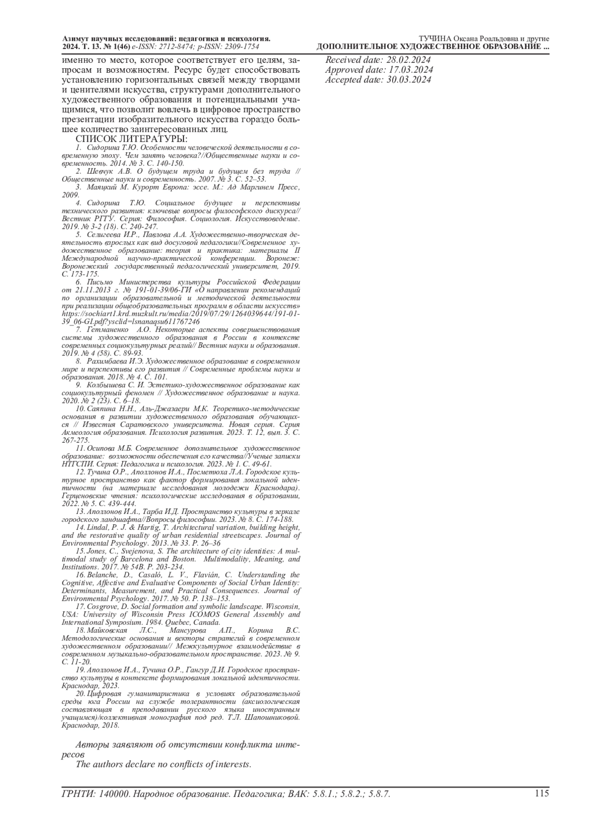 10. Саяпина Н.Н., Аль-Джазаери М.К. Теоретико-методические основания в развитии художественного образования обучающихся // Известия Саратовского университета. Новая серия. Серия Акмеология образования. Психология развития. 2023. Т. 12, вып. 3. С. 267-275. EDN: JSNPXE