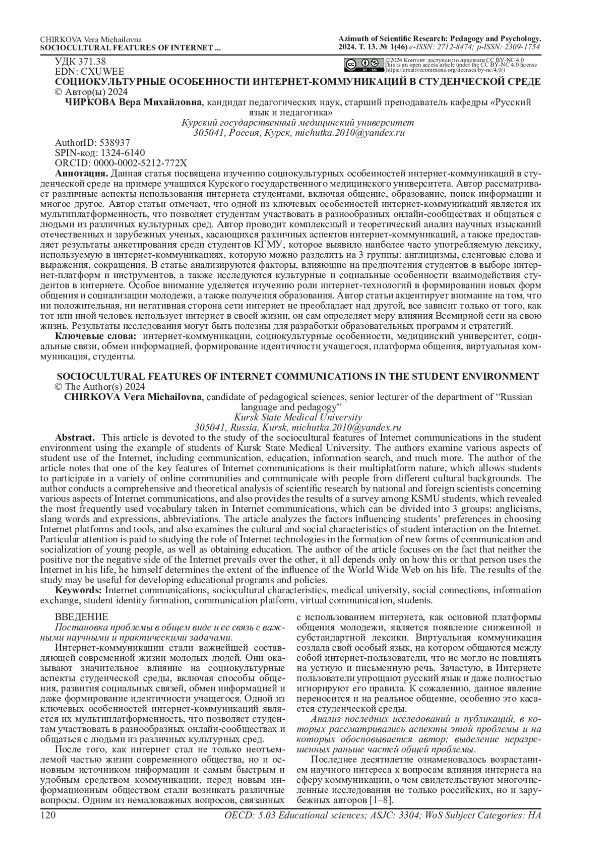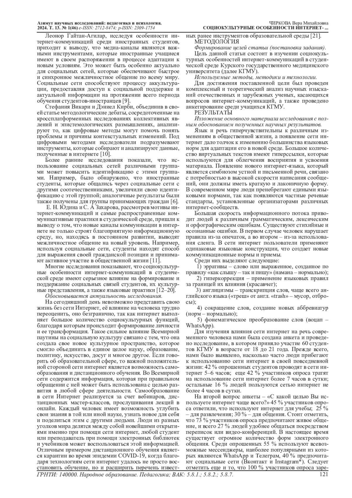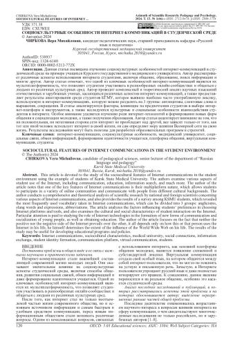 Данная статья посвящена изучению социокультурных особенностей интернет-коммуникаций в студенческой среде на примере учащихся Курского государственного медицинского университета. Автор рассматривает различные аспекты использования интернета студентами, включая общение, образование, поиск информации и многое другое. Автор статьи отмечает, что одной из ключевых особенностей интернет-коммуникаций является их мультиплатформенность, что позволяет студентам участвовать в разнообразных онлайн-сообществах и общаться с людьми из различных культурных сред. Автор проводит комплексный и теоретический анализ научных изысканий отечественных и зарубежных ученых, касающихся различных аспектов интернет-коммуникаций, а также предоставляет результаты анкетирования среди студентов КГМУ, которое выявило наиболее часто употребляемую лексику, используемую в интернет-коммуникациях, которую можно разделить на 3 группы: англицизмы, сленговые слова и выражения, сокращения. В статье анализируются факторы, влияющие на предпочтения студентов в выборе интернет-платформ и инструментов, а также исследуются культурные и социальные особенности взаимодействия студентов в интернете. Особое внимание уделяется изучению роли интернет-технологий в формировании новых форм общения и социализации молодежи, а также получения образования. Автор статьи акцентирует внимание на том, что ни положительная, ни негативная сторона сети интернет не преобладает над другой, все зависит только от того, как тот или иной человек использует интернет в своей жизни, он сам определяет меру влияния Всемирной сети на свою жизнь. Результаты исследования могут быть полезны для разработки образовательных программ и стратегий.