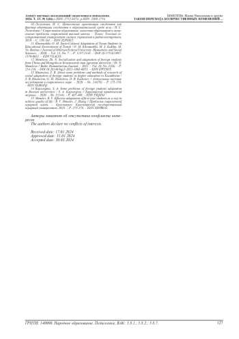 13. Khamzina, Z. B. About some problems and methods of research of social adaptation of foreign students in higher education in Kazakhstan / Z. B. Khamzina, G. M. Zhalelova, D. B. Kaikenov // Актуальные научные исследования в современном мире. - 2020. - No. 2-6(58). - P. 155-158. EDN: YLHGFQ