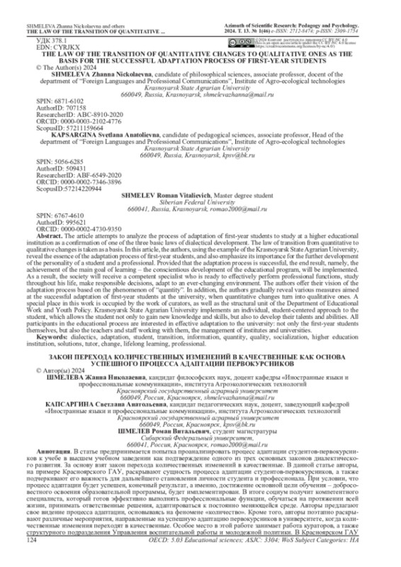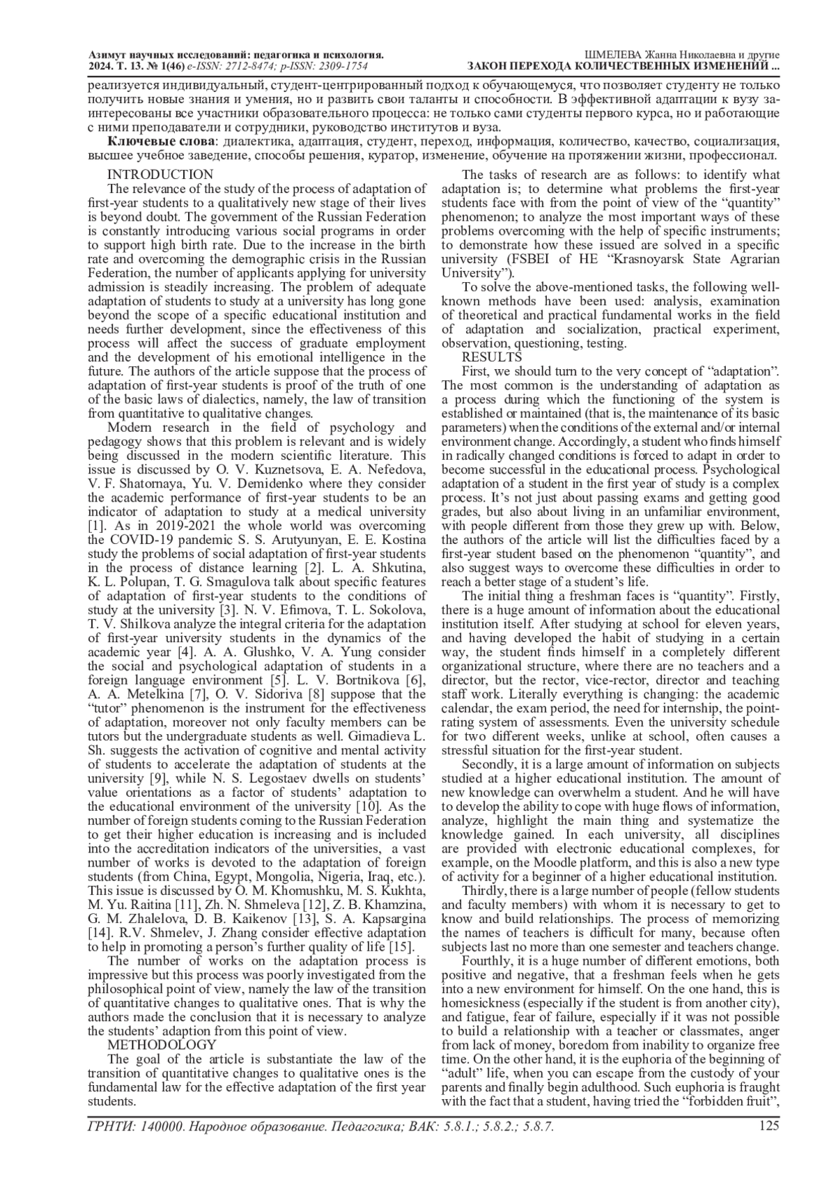В статье предпринимается попытка проанализировать процесс адаптации студентов-первокурсников к учебе в высшем учебном заведении как подтверждение одного из трех основных законов диалектического развития. За основу взят закон перехода количественных изменений в качественные. В данной статье авторы, на примере Красноярского ГАУ, раскрывают сущность процесса адаптации студентов-первокурсников, а также подчеркивают его важность для дальнейшего становления личности студента и профессионала. При условии, что процесс адаптации будет успешен, конечный результат, а именно, достижение основной цели обучения – добросовестного освоения образовательной программы, будет имплементирован. В итоге социум получит компетентного специалиста, который готов эффективно выполнять профессиональные функции, обучаться на протяжении всей жизни, принимать ответственные решения, адаптироваться к постоянно меняющейся среде. Авторы предлагают свое видение процесса адаптации, основываясь на феномене «количество». Кроме того, авторы поэтапно раскрывают различные мероприятия, направленные на успешную адаптацию первокурсников в университете, когда количественные изменения переходят в качественные. Особое место в этой работе занимает работа кураторов, а также структурного подразделения Управления воспитательной работы и молодежной политики. В Красноярском ГАУ реализуется индивидуальный, студент-центрированный подход к обучающемуся, что позволяет студенту не только получить новые знания и умения, но и развить свои таланты и способности. В эффективной адаптации к вузу заинтересованы все участники образовательного процесса: не только сами студенты первого курса, но и работающие с ними преподаватели и сотрудники, руководство институтов и вуза.