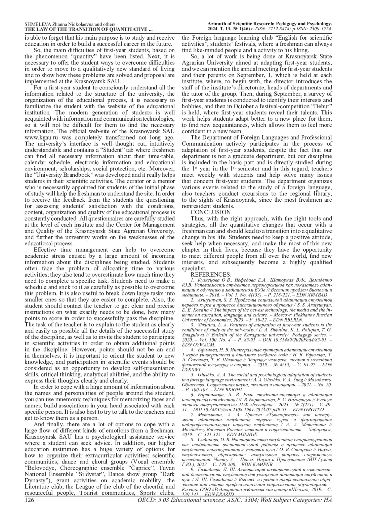 3. Shkutina, L. A. Features of adaptation of first-year students to the conditions of study at the university / L. A. Shkutina, K. L. Polupan, T. G. Smagulova // Bulletin of the Karaganda university. Pedagogy series. - 2020. - Vol. 100, No. 4. - P. 85-91. DOI: 10.31489/2020Ped4/85-91 EDN: OYWACM