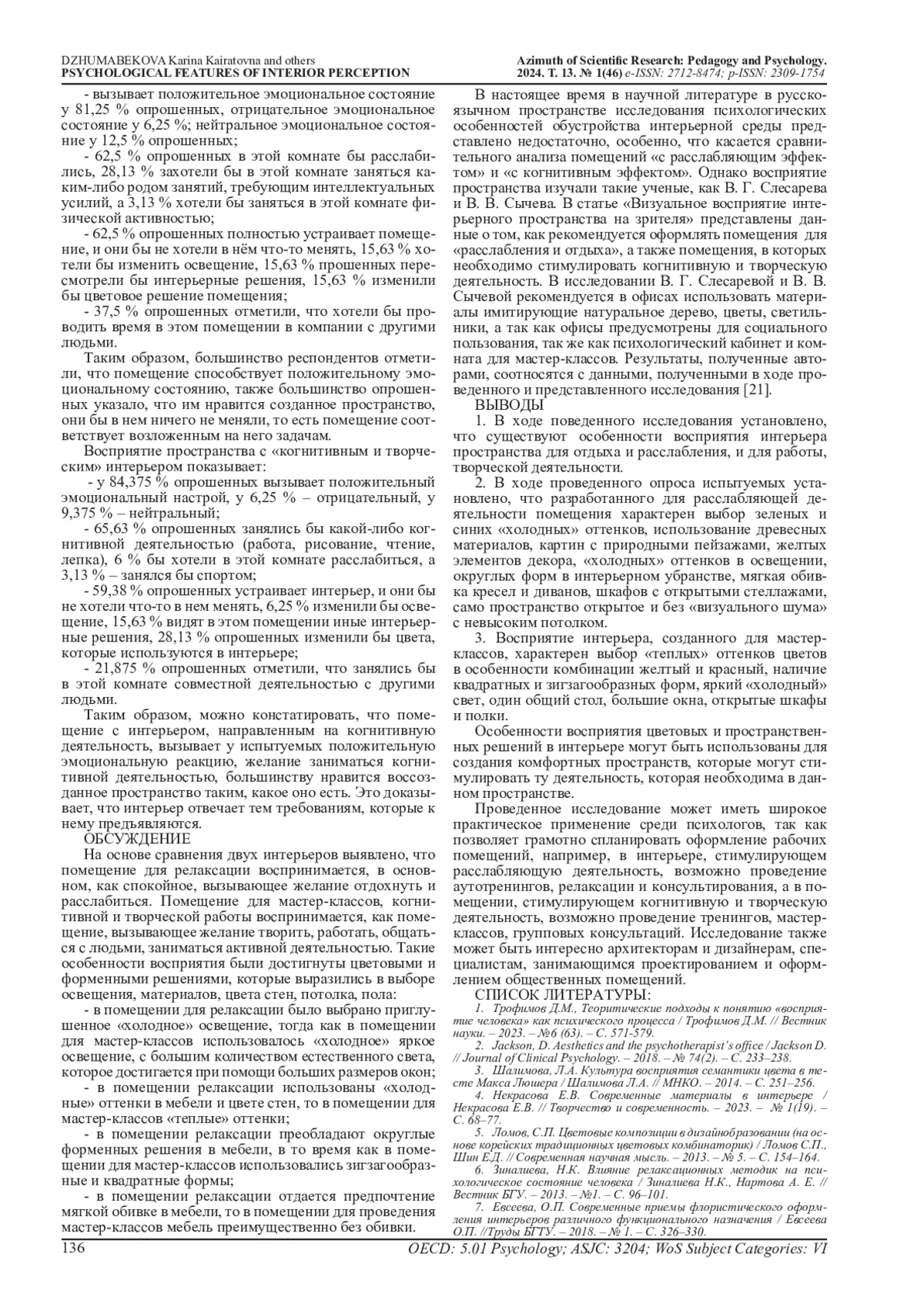 13. Miwa, Y., Hanyu, K. The Effects of Interior Design on Communication and Impressions of a Counselor in a Counseling Room / Miwa Y. // Environment and Behavior. - 2006. - 38(4). - С.484-502. EDN: JRMHPJ