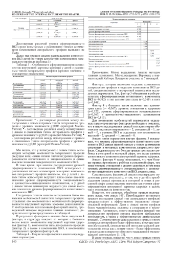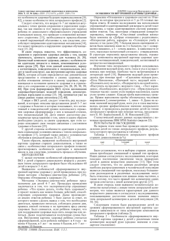 Известно, что успешность обучения в начальной школе зависит от многих факторов, одним из которых является эффективность процессов адаптации. В свою очередь в ряде работ показано, что процессы адаптации связаны особенностями латерального профиля, а также с особенностями здоровья детей. Таким образом, целью данного исследования было изучение особенностей латерального профиля старших дошкольников, а также особенностей внутренней картины здоровья (ВКЗ) у детей с различным типом латерального профиля. Было обследовано 60 детей в возрасте 5-6 лет. Выявление особенностей ВКЗ у детей проводилось при помощи методик: «Экспресс-диагностика ребенка» [25], Опросник «Отношение к здоровью» [5]. Изучения типа латерального профиля складывалась из выявления ведущей руки, ноги, глаза и уха и осуществлялась при помощи, наиболее часто встречающиеся в литературе проб [18]. Выявлено, что наиболее высокие значения уровня внутренней картины здоровья характерны для старших дошкольников с правым типом асимметрии моторных и левым типом асимметрии сенсорных компонентов латерального профиля. Наибольший вклад в уровень ВКЗ дошкольников вносит эмоциональный компонент.