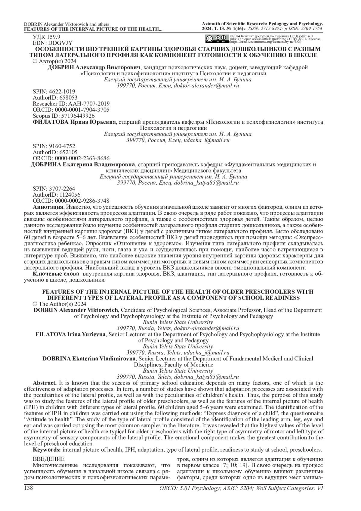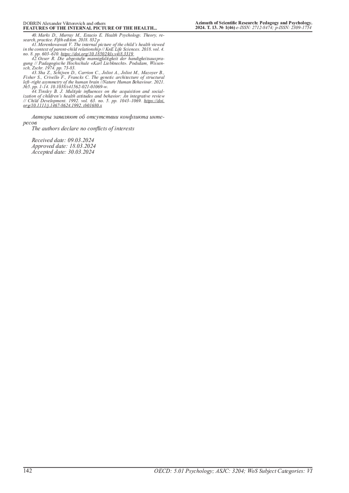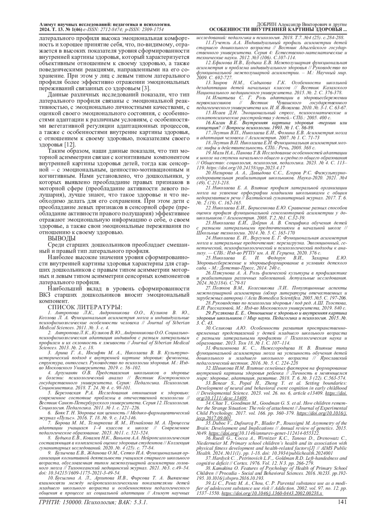 38. Kamakina O. Features of Psychology of Health of Primary School Children // Procedia - Social and Behavioral Sciences. 2016. №233. pp.192-195. DOI: 10.1016/j.sbspro.2016.10.193
