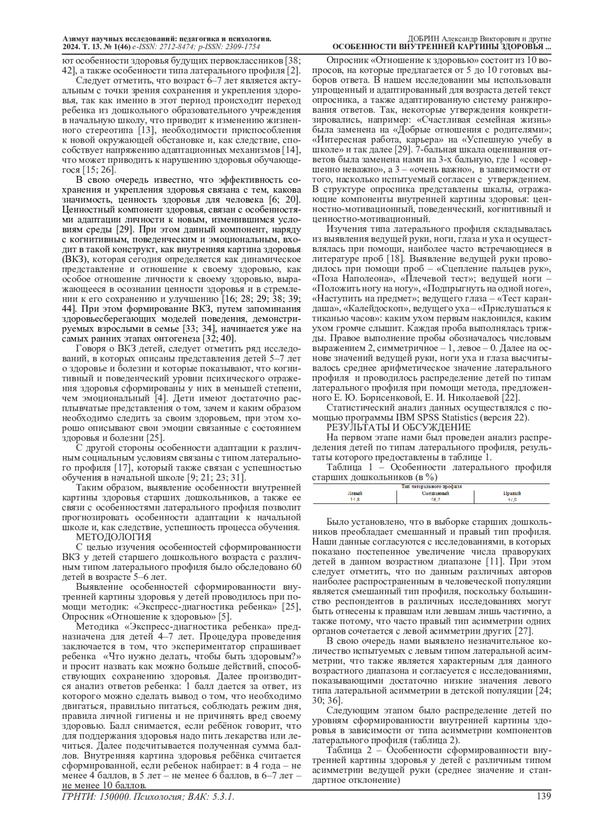 22. Николаева Е.И., Борисенкова Е.Ю. Сравнение разных способов оценки профиля функциональной сенсомоторной асимметрии у дошкольников // Асимметрия. 2008. Т.2, №1. С.32-39. EDN: MSOSDT