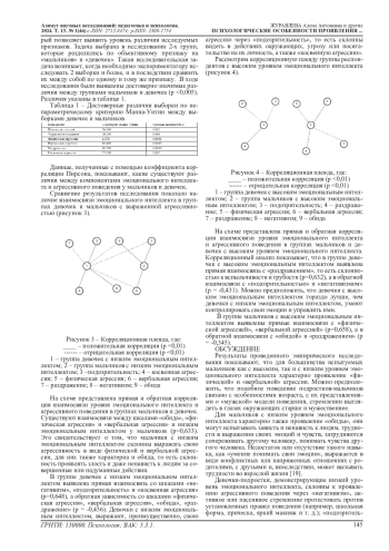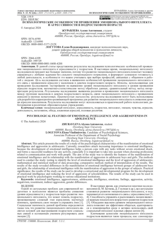 Результаты исследования: выявлены различия в проявлении эмоционального интеллекта между группами мальчиков и девочек подросткового возраста, связи эмоционального интеллекта с проявлением агрессии в группах испытуемых.