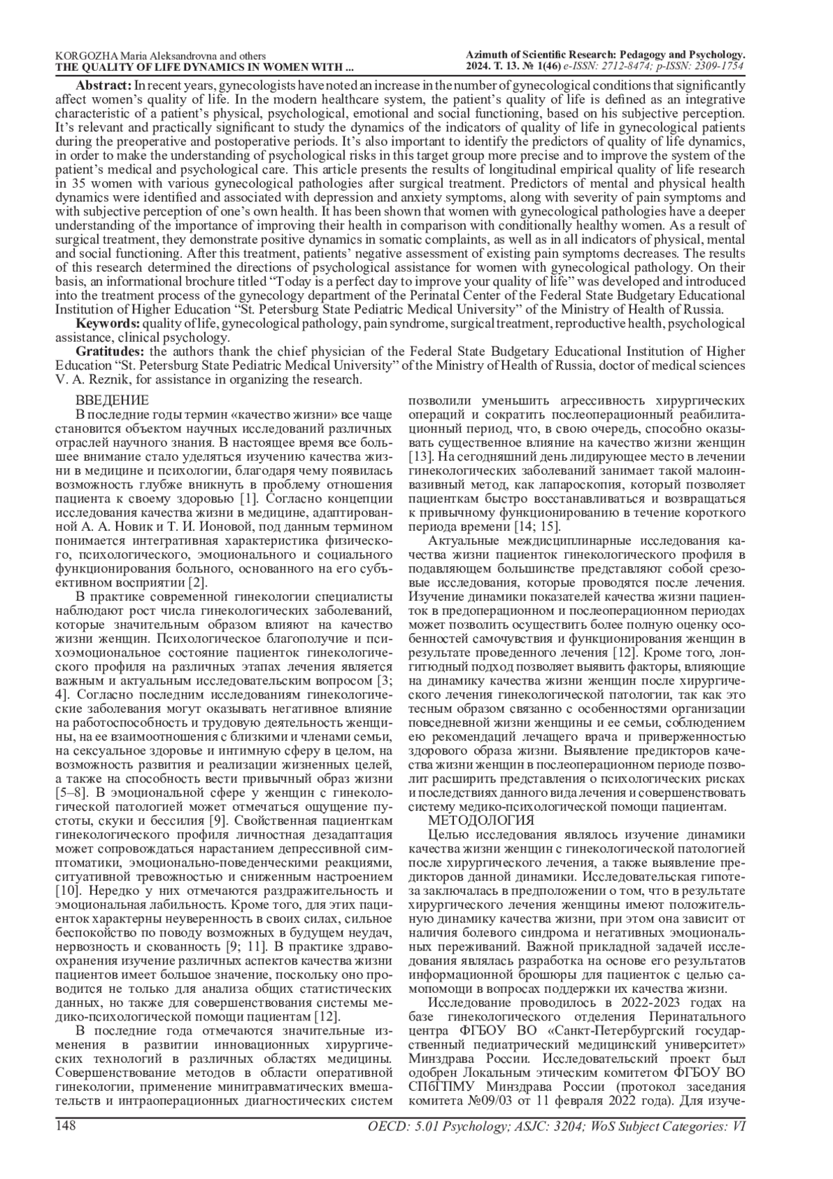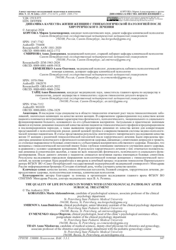 В последние года специалисты в области гинекологии отмечают рост числа гинекологических заболеваний, значительно влияющих на качество жизни женщин. В современном здравоохранении под качеством жизни пациента понимается интегративная характеристика физического, психологического, эмоционального и социального функционирования больного, основанного на его субъективном восприятии. Актуальным и практически значимым является изучение динамики показателей качества жизни пациенток гинекологического профиля в предоперационном и послеоперационном периодах, а также выявление предикторов динамики их качества жизни для конкретизации представлений о психологических рисках данной целевой группы и совершенствования системы медико-психологической помощи пациенткам. В статье представлены результаты лонгитюдного эмпирического исследования качества жизни 35 женщин с различной гинекологической патологией после хирургического лечения. Были определены предикторы динамики психического и физического компонентов здоровья, связанные с симптомами депрессии и тревоги, со степенью выраженности болевых симптомов и с субъективным восприятием собственного здоровья. Показано, что женщины с гинекологической патологией имеют более глубокое понимание значимости улучшения своего здоровья, в сравнении с условно здоровыми женщинами. В результате хирургического лечения у них отмечается положительная динамика в соматических жалобах, а также во всех показателях физического, психического и социального функционирования. После данного лечения у пациенток снижается негативная оценка имеющихся болевых симптомов. Результаты исследования определили направления психологической помощи женщинам с гинекологической патологией, на основе которых была разработана и внедрена в лечебный процесс отделения гинекологии Перинатального центра ФГБОУ ВО «Санкт-Петербургский государственный педиатрический медицинский университет» Минздрава России информационная брошюра «Сегодня отличный день, чтобы улучшить качество жизни».