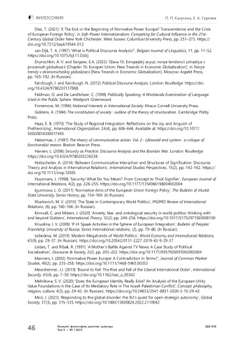 31. Diez T. X. The End or the Beginning of Normative Power Europe? Transcendence and the Crisis of European Foreign Policy // Soft-Power Internationalism: Competing for Cultural Influence in the 21st-Century Global Order. - New York Chichester, West Sussex: Columbia University Press, 2021. - P. 251-273. https://doi.org/10.7312/bayk19544-012