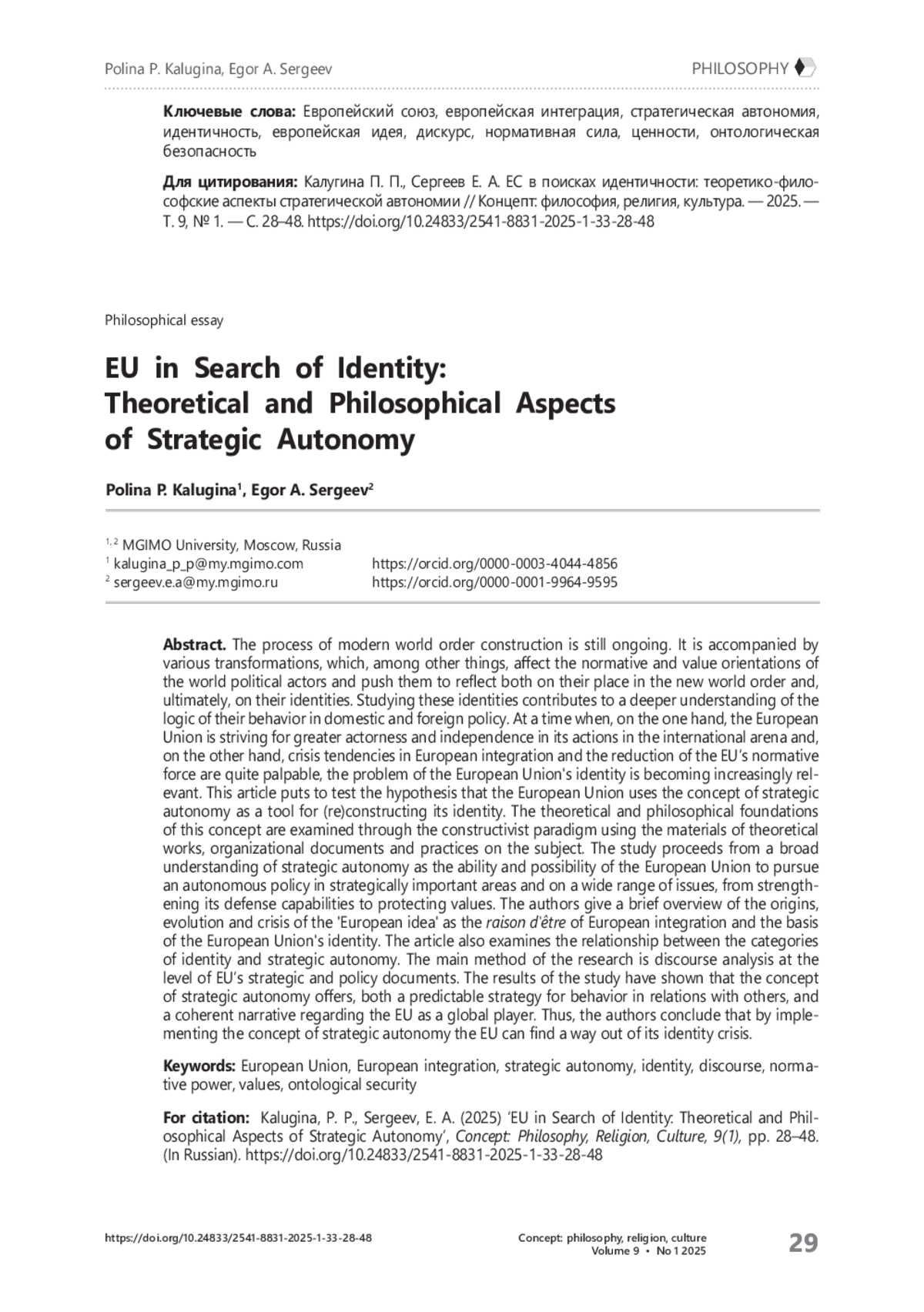 Современный мировой порядок находится в процессе становления. Этот процесс сопряжён с разнообразными трансформациями, которые в том числе затрагивают нормативноценностные ориентации субъектов мировой политики и подталкивают их к рефлексии относительно своего места в новом мире и в конечном итоге — относительно своей идентичности. Изучение идентичностей акторов мировой политики способствует углублению понимания логики их поведения во внутренней и внешней политике. В условиях, когда Европейский союз, с одной стороны, стремится к большей акторности и независимости в своих действиях на международной арене а, с другой стороны, в европейской интеграции наличествуют кризисные тенденции и наблюдается кризис нормативной силы европейского проекта, проблема идентичности Европейского союза приобретает всё большую актуальность. В настоящей статье исследуется гипотеза о том, что в качестве инструмента (ре)конструирования своей идентичности Европейский союз использует концепцию стратегической автономии. Через призму конструктивизма рассматриваются теоретико-философские основы этой концепции. Авторы исходят из широкого понимания стратегической автономии как способности и возможности Европейского союза для проведения самостоятельной политики в стратегически важных областях и по широкому кругу вопросов — от укрепления обороноспособности до защиты ценностей. Приводится краткий обзор истоков, эволюции и кризиса «европейской идеи» как raison d’être европейской интеграции и основы идентичности Европейского союза. Рассматривается вопрос о связи между категориями идентичности и стратегической автономии. Основным методом исследования выступает дискурс-анализ на уровне стратегических и программных документов ЕС. Результаты проведённого исследования позволяют сделать вывод о том, что реализация концепции стратегической автономии может предложить ЕС выход из кризиса идентичности, так как она предлагает, с одной стороны, предсказуемую стратегию поведения в отношениях с Другими и, с другой стороны, последовательный нарратив о ЕС как глобальном игроке.