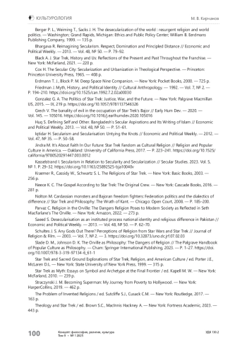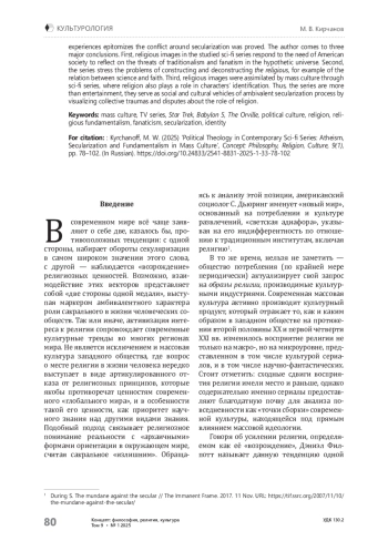 Изучение процессов осмысления и переосмысления религиозного опыта западного общества актуально прежде всего в свете современной повестки культурной конфронтации, определившей ценностное противостояние различных цивилизационных типов. Цель данного исследования состоит в уточнении роли научнофантастических сериалов в массовой культуре западного общества. Достижению данной цели способствует решение следующих задач: 1) выявление основных тенденций, с помощью которых политическая теология массовой культуры воспроизводит религиозные мотивы; 2) изучение основных проблем, связанных с актуализацией и визуализацией религиозных проблем как политических в научно-фантастическом дискурсе; 3) уточнение возможных векторов и дальнейших траекторий развития политически и идеологически инструментализированных религиозных образов в современном научно-фантастическом дискурсе. Материалами исследования ограничены научно-фантастическими сериалами, генетически связанных со вселенной «Звёздного пути»: классические (такие, как «Звёздный путь» и «Вавилон 5») и современные («Орвилл»). Показано, что эти сериалы играют значительную роль в современной истории общества потребления. Одновременно они являются формами развития политической культуры и исторической коллективной памяти, а также формой визуализированной политической теологии. Обращение к анализу заявленной проблематики потребовало привлечения таких теоретических подходов, как интеллектуальная история и история идей, а также достижений междисциплинарной историографии и социологии, сфокусированной на анализе роли и места религии в процессах секуляризации. Используя дискурс-анализ и биографический метод, автор показывает, как современная массовая культура ассимилирует религиозное. В результате исследования нашла подтверждение гипотеза о том, что визуализация религиозного опыта стала отражением конфликта между сторонниками секуляризации и их оппонентами. В качестве основных выводов следует обозначить ряд положений. Во-первых, в работе прослежено, какие социокультурные запросы реализуют образы религиозного в рассмотренных сериалах: они представляют собой «возможные миры», где американское обще ство получило возможность рефлексировать по поводу вызовов и угроз традиционализма и фанатизма. Во-вторых, основными проблемами, представленными в сериалах, стали проблемы конструирования и деконструкции религиозного (отношения веры и атеизма, науки и религии, вторичная «клерикализация» виртуального мира будущего, фанатизм, национализм и ксенофобия, политическая архаизация и идеологизация веры). В-третьих, показано, что религиозные мотивы в анализируемых сериалах стали объектами ассимиляции массовой культуры, причём вместо заявленного преодоления религии создатели сериалов сконструировали ещё одно культурное пространство, где вера актуализирует свои качества в качестве одного из сегментов идентичности. Таким образом формально развлекательные сериалы «Звёздный путь», «Вавилон 5» и «Орвилл» стали фактически социальными и культурными механизмами амбивалентного процесса секуляризации. Они актуализировали визуальными средствами коллективные идеологические, политические, исторические травмы и противоречия, полученные современным западным обществом в е
