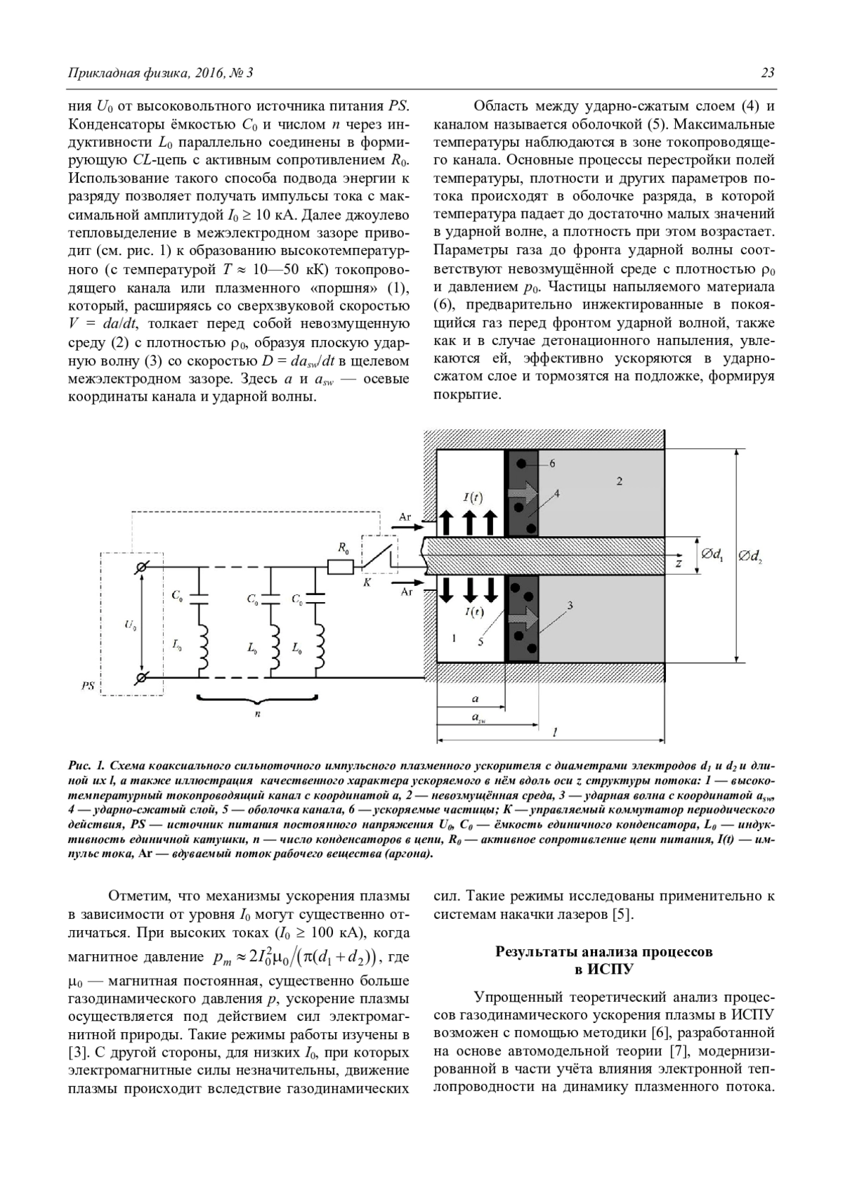 В работе проведён теоретический анализ основных газо- и электродинамических процессов, протекающих в технологических коаксиальных импульсных сильноточных плазменных ускорителей (ИСПУ) для напыления износостойких покрытий из тугоплавких материалов. Получены соотношения, связывающие режимные и геометрические параметры ускорителей с основными характеристиками генерируемых ими сверхзвуковых газоплазменных потоков. Показано, что в электрической цепи питания целесообразно использовать конденсатор с ёмкостью С0 = (1—3) 103 мкФ, заряжаемый до напряжения U0 = 1—3 кВ. В этом случае возможна генерация газоплазменных потоков с максимальными скоростями Dmax 1,0—8,0 км/с. Проанализирован процесс ускорения частиц карбида вольфрама в таких потоках. Установлено, что для этого дисперсность напыляемых частиц должна быть не более dp 150 мкм при длине ИСПУ l 0,8—1,2 м.