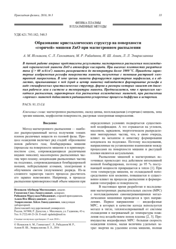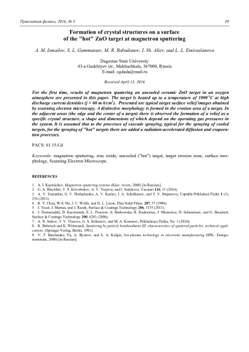 Исмаилов А. М., Гамматаев С. Л., Рабаданов М. Р., Алиев И. Ш., Эмирасланова Л. Л. Образование кристаллических структур на поверхности «горячей» мишени ZnO при магнетронном распылении 33