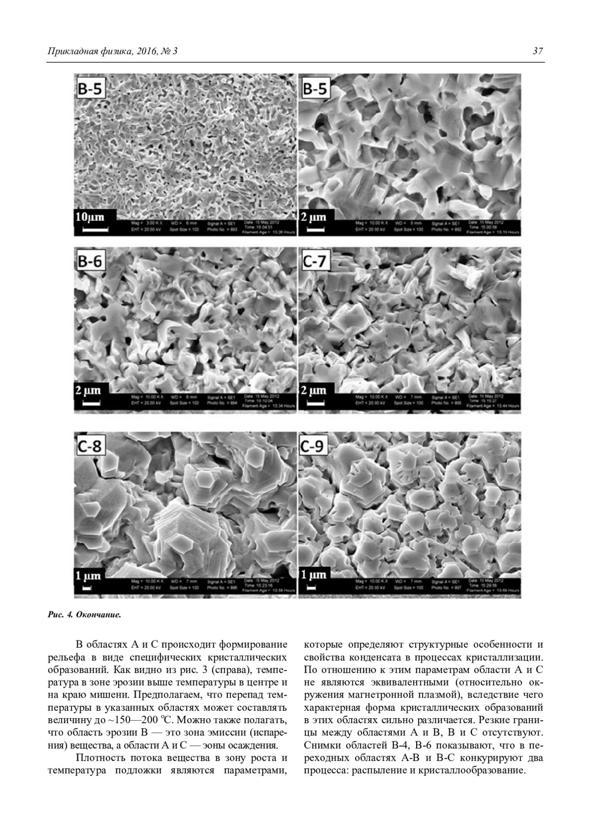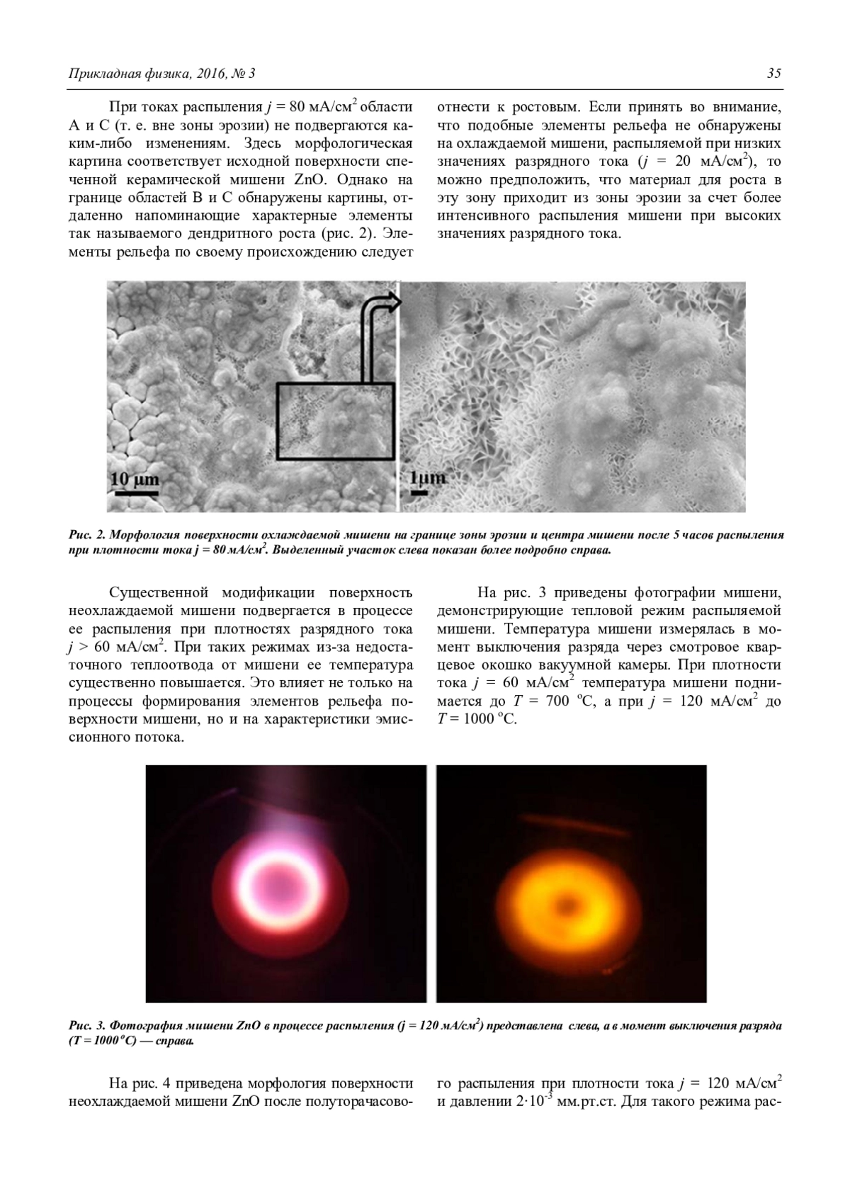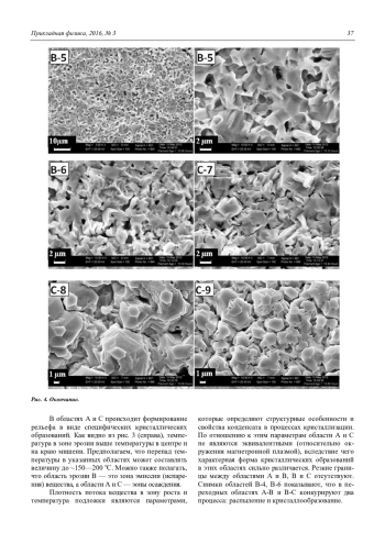«Горячая» мишень, наряду с атомарным потоком, эмитирует микрометровые частицы, которые, попадая на ростовую поверхность, играют основную роль в процессах формирования эпитаксиальных пленок ZnO на аморфных и монокристаллических подложках. Также представляет интерес исследования процессов кристаллизации, происходящих на кусочках-подложках, помещенных в области роста на поверхности мишени (центр и край мишени). Работа в этом направлении уже проводится и будет отражена в следующих наших публикациях.