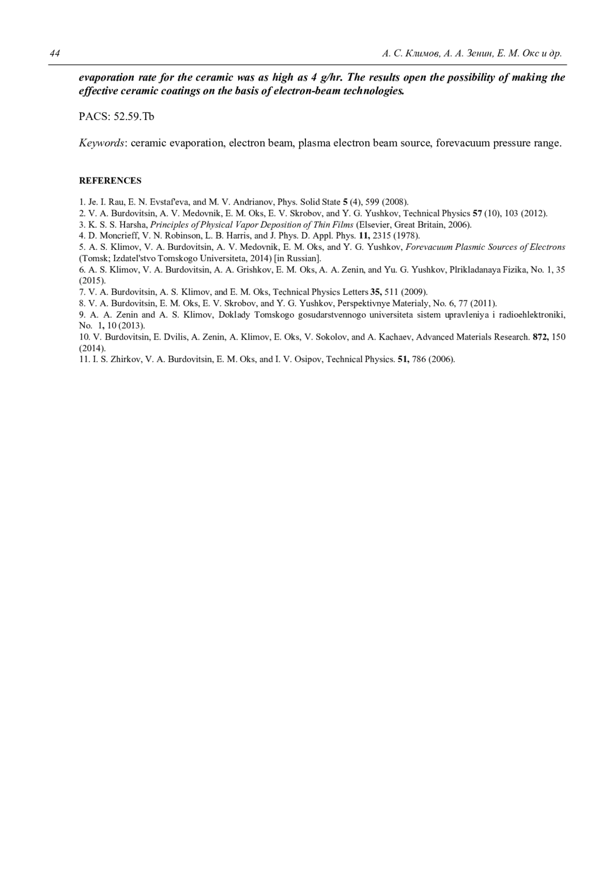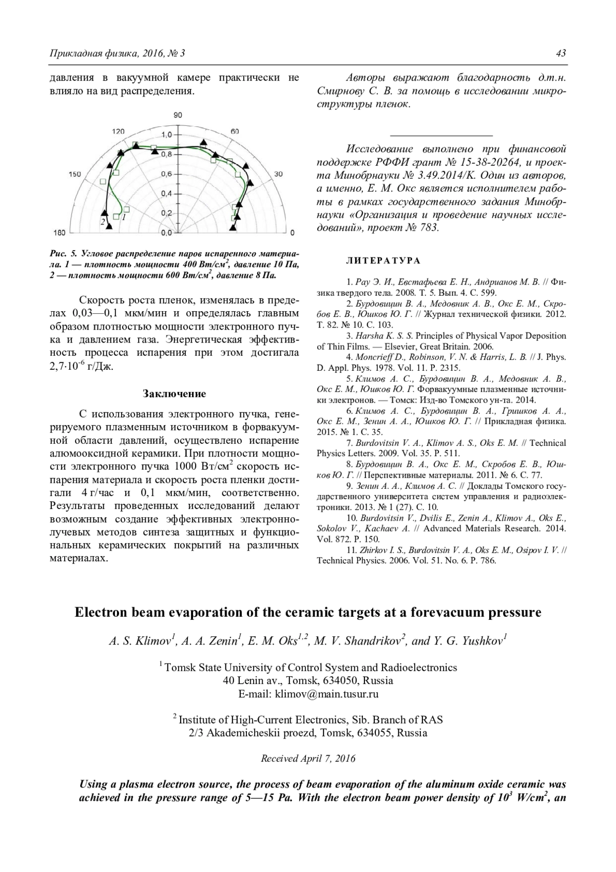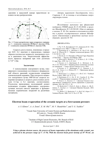 Климов А. С., Зенин А. А., Окс Е. М., Шандриков М. В., Юшков Ю. Г. Электронно-лучевое испарение керамики в форвакуумном диапазоне давлений 40