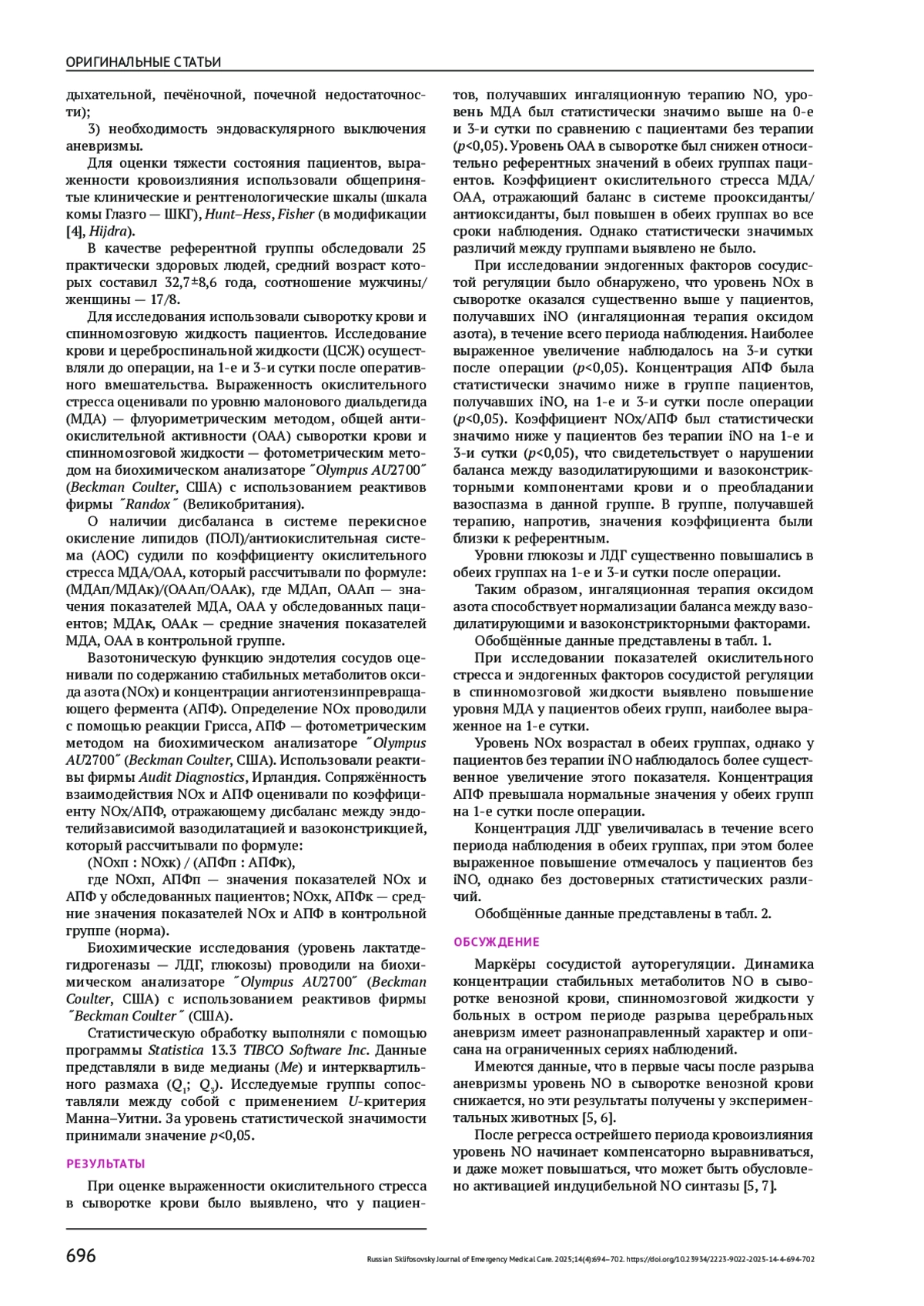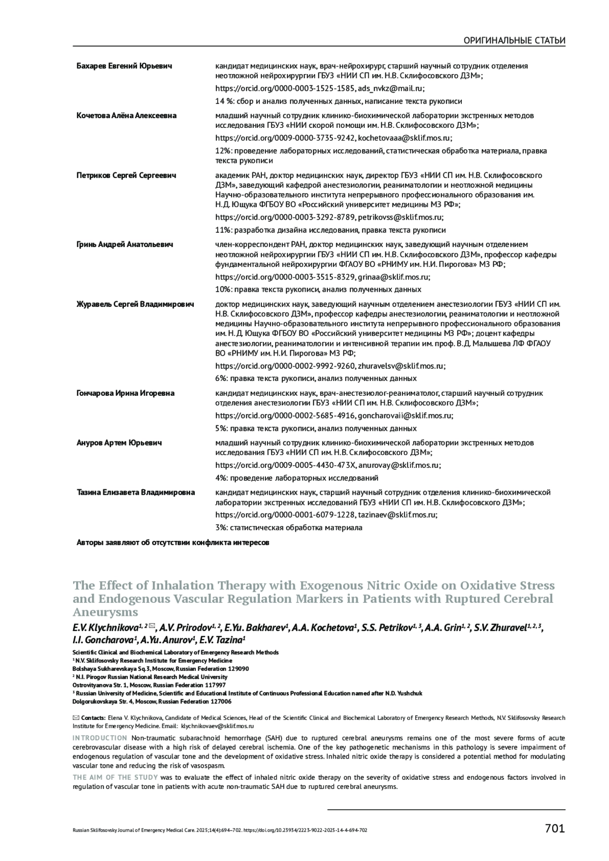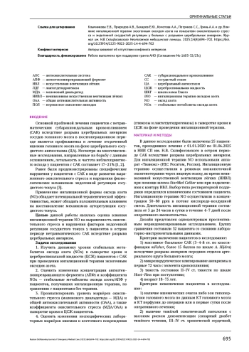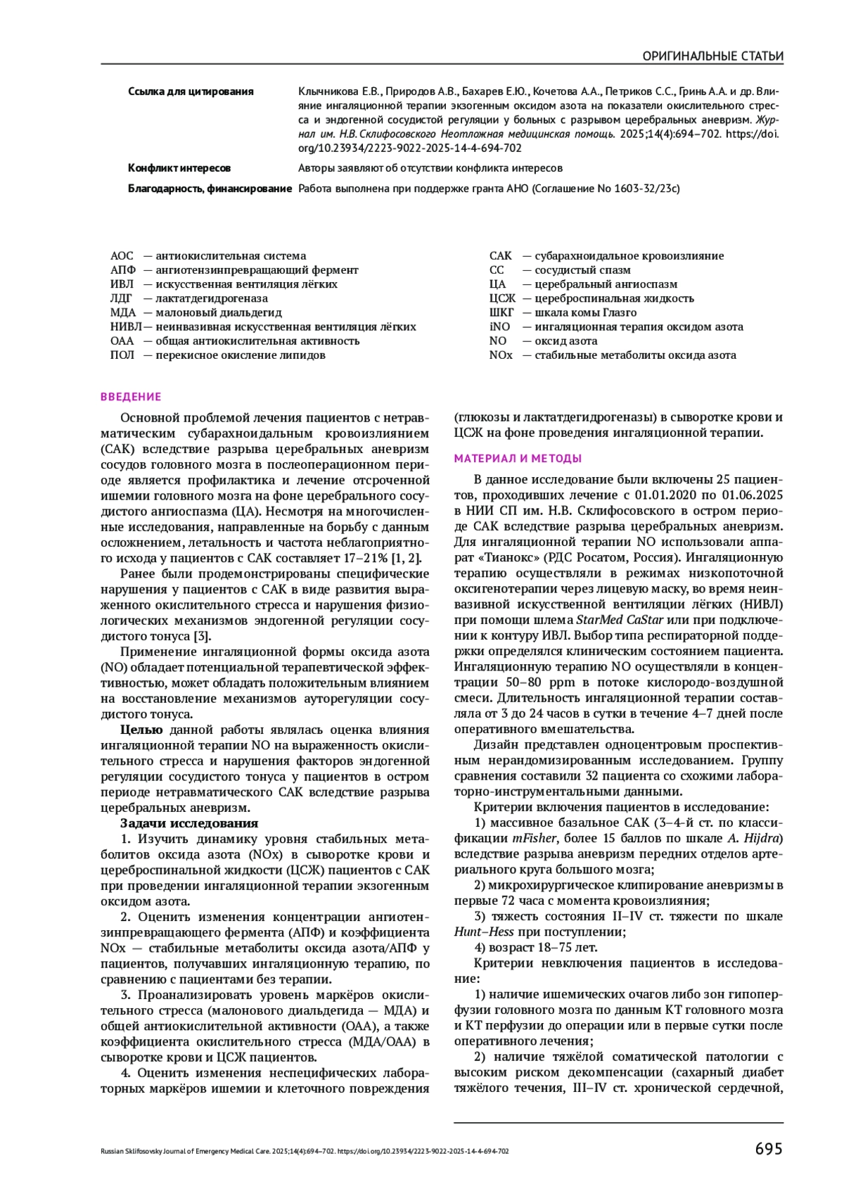 3. Клычникова Е.В., Петриков С.С., Природов А.В., Бахарев Е.Ю., Силкин С.В., Тазина Е.В., и др. Динамика показателей окислительного стресса и эндогенных факторов сосудистой регуляции у больных при нетравматическом субарахноидальном кровоизлиянии вследствие разрыва церебральных аневризм. Журнал им. Н.В. Склифосовского “Неотложная медицинская помощь”. 2024;13(4):562-569. DOI: 10.23934/2223-9022-2024-13-4-562-569