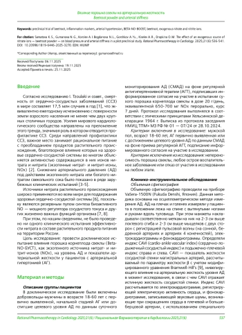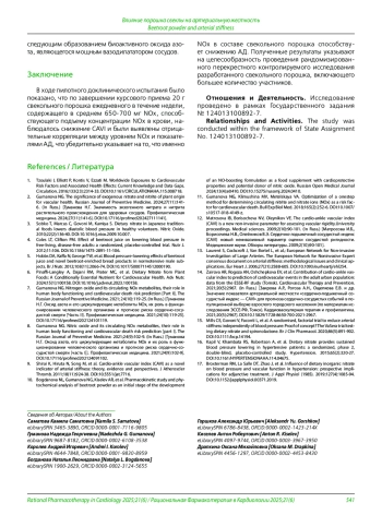10. Bogdanova NL, Gumanova NG, Kiselev AR, et al. Pharmacokinetic study and phytochemical analysis of beetroot powder as an initial stage of the development of an NO-boosting formulation as a food supplement with cardioprotective properties and potential donor of nitric oxide. Russian Open Medical Journal 2024;13(4):e0410. DOI: 10.15275/rusomj.2024.0410