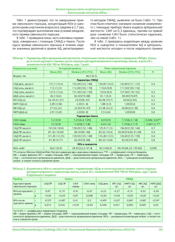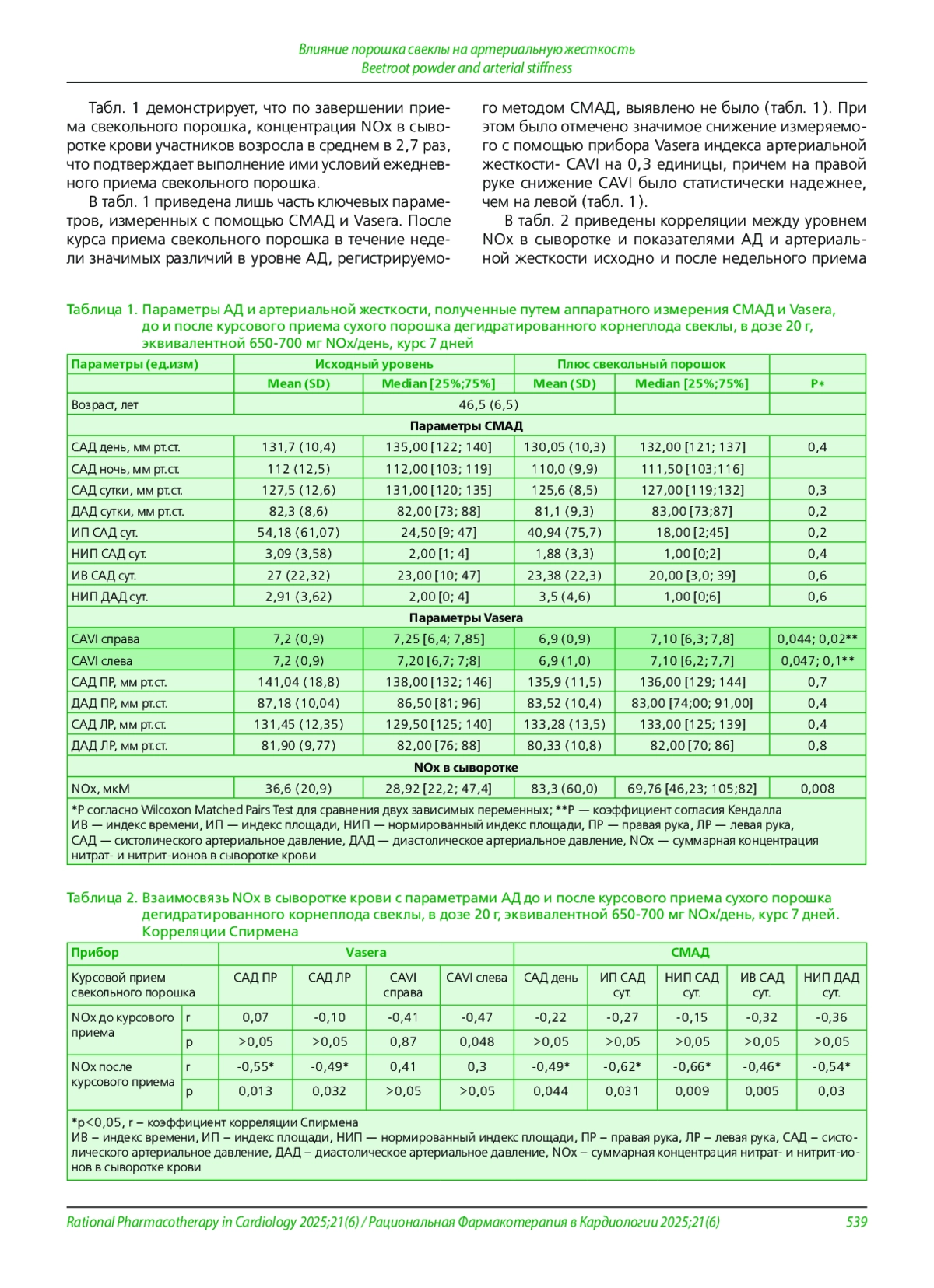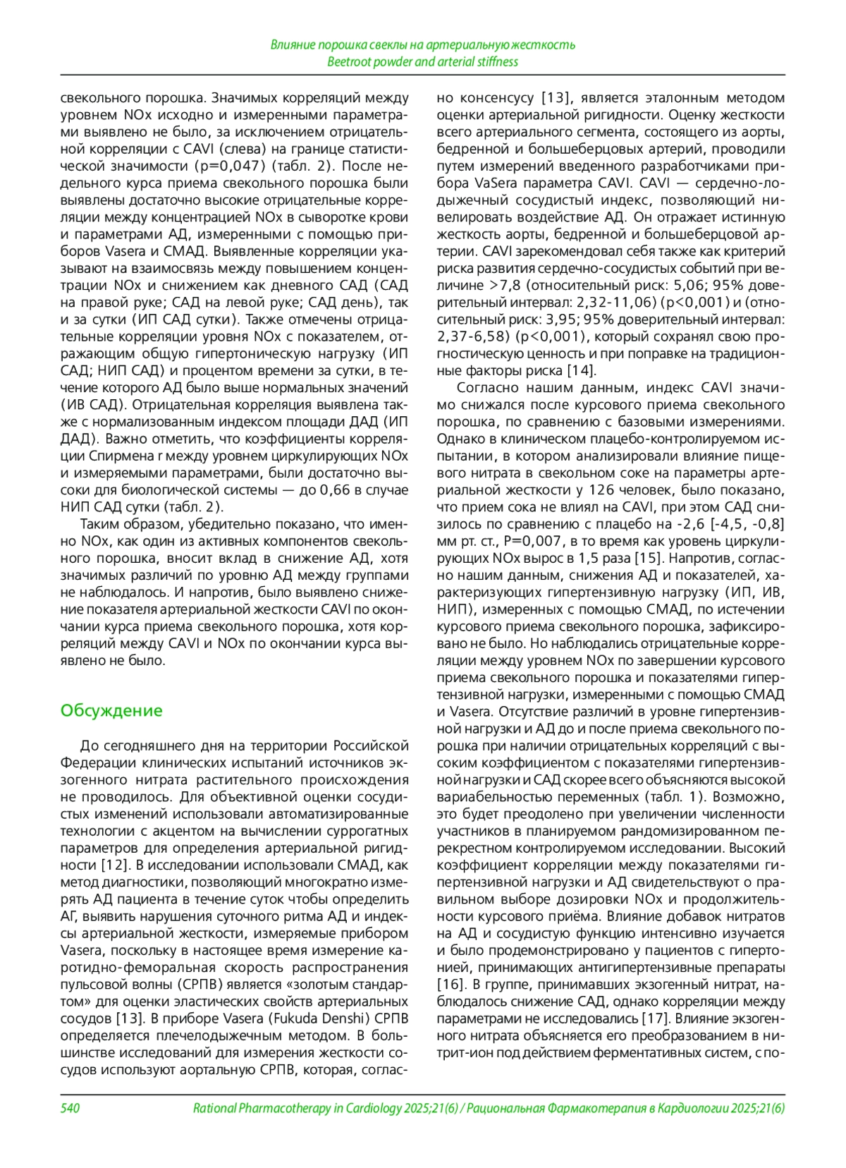 Результаты. По завершении приема свекольного порошка «Beta-NO-БУСТ», концентрация NOx в сыворотке крови участников возросла в среднем в 2,7 раз, что подтверждает выполнение ими условий протокола исследования. Значимых различий в уровне АД до и после приема Beta-NO-БУСТ выявлено не было, но отмечалось значимое снижение на 0,3 единицы показателя артериальной жесткости — CAVI. Также, после недельного курса Beta-NO-БУСТ были выявлены отрицательные корреляции между концентрацией NOx и параметрами АД с высоким коэффициентом r, достигавшим величины -0,66.